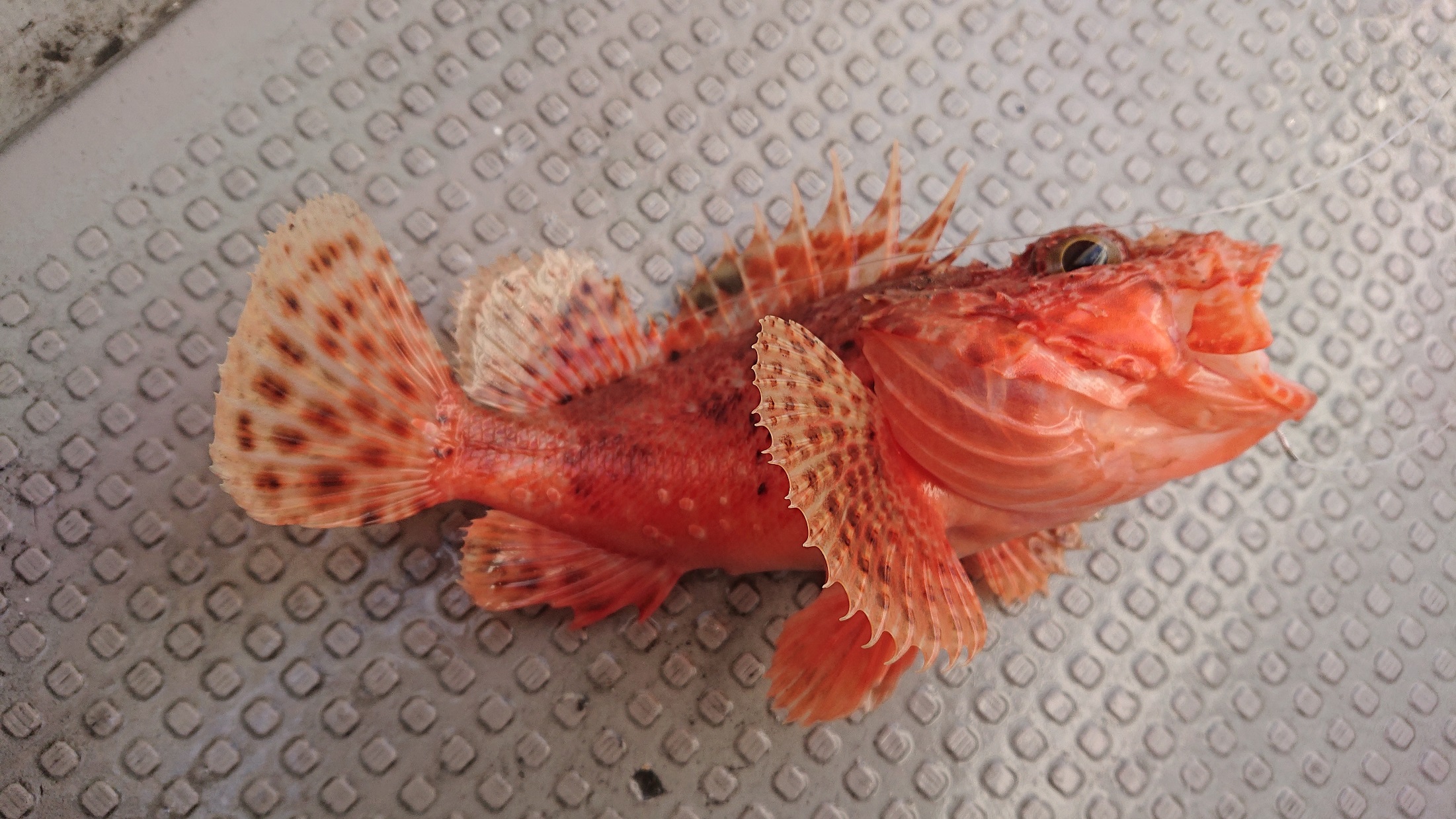 シーズンのアマダイ釣りに行って来ました。朝6時半出船、大井川沖のポイントまでは30分程です。風が強く、ウネリがあり開始早々船酔いになりグロッキーな状態・・・水深90m付近、船長から底から5m上げての指示。コマセ用のオキアミが溶けてなかったので、刺し餌だけ付けて落とすとすぐアタリが!まずは25cmくらいのアジが釣れました。コマセを撒かないと後が続かないということで、同船者の方から少しコマセ用のオキアミを分けてもらい開始。外道が飽きないくらいに釣れます。初めての釣種オニカサゴやエビスダイ、塩焼きサイズのレンコダイが釣れました。しかし、アマダイはなかなか釣れません。イメージとしては底べったりに狙うとカサゴなどの根魚が釣れ、底を1.5mくらい切るとアマダイ、それより上だと回遊しているアジが狙えます。続いて、アジがまとまって釣れる漁礁のポイントへ、水深36m指示でやっていると良く引く魚がヒット!茶色い・・・デカイ!!良型のオオモンハタでした。重さは測っていませんが大きさは47cmでした。この大きさは初めてです。同行の松永さんには青物オンパレード!イナダやワラサが釣れていました。豆アジが回遊していたので、大型の青物の回遊?私にも掛かったようでしたが、ハリスを一瞬で切られました。後半はもう一度アマダイ本命狙いです。風もウネリも無くなり、しっかり誘わないと釣れない状況になりました。着底したら、しゃくり上げ底を切って止めるの繰り返しでコココン!とアタリが!小気味よい引きで、最後に上の方でも粘って抵抗します。30cmほどで小ぶりですがやっと本命のアマダイが釣れました。その後は終了までアジがパラパラ釣れました。2セット入りの仕掛けを2枚用意しましたが、おまつりもあり2枚では足りなくなりました。2セット入りの仕掛けを3枚は用意することをおすすめします。サバフグも回遊していたので、天秤やコマセカゴ、オモリは予備で2セットは用意必須です。氷は出船前と帰りに2回もらえます。今回の釣果は、アマダイ1匹、アジ(マアジ、アオアジ)12匹、サバ3匹、オウモンハタ、エビスダイ、オニカサゴ(リリース)、レンコダイ、カサゴ、ヒメ、サバフグ(リリース)など五目釣りが出来大満足な釣行でした。水温が下がればもっとアジが釣れるようなので、またリベンジしたいです。