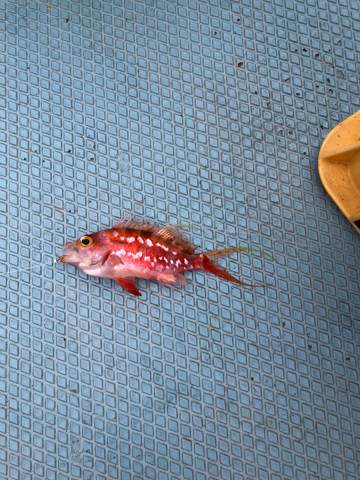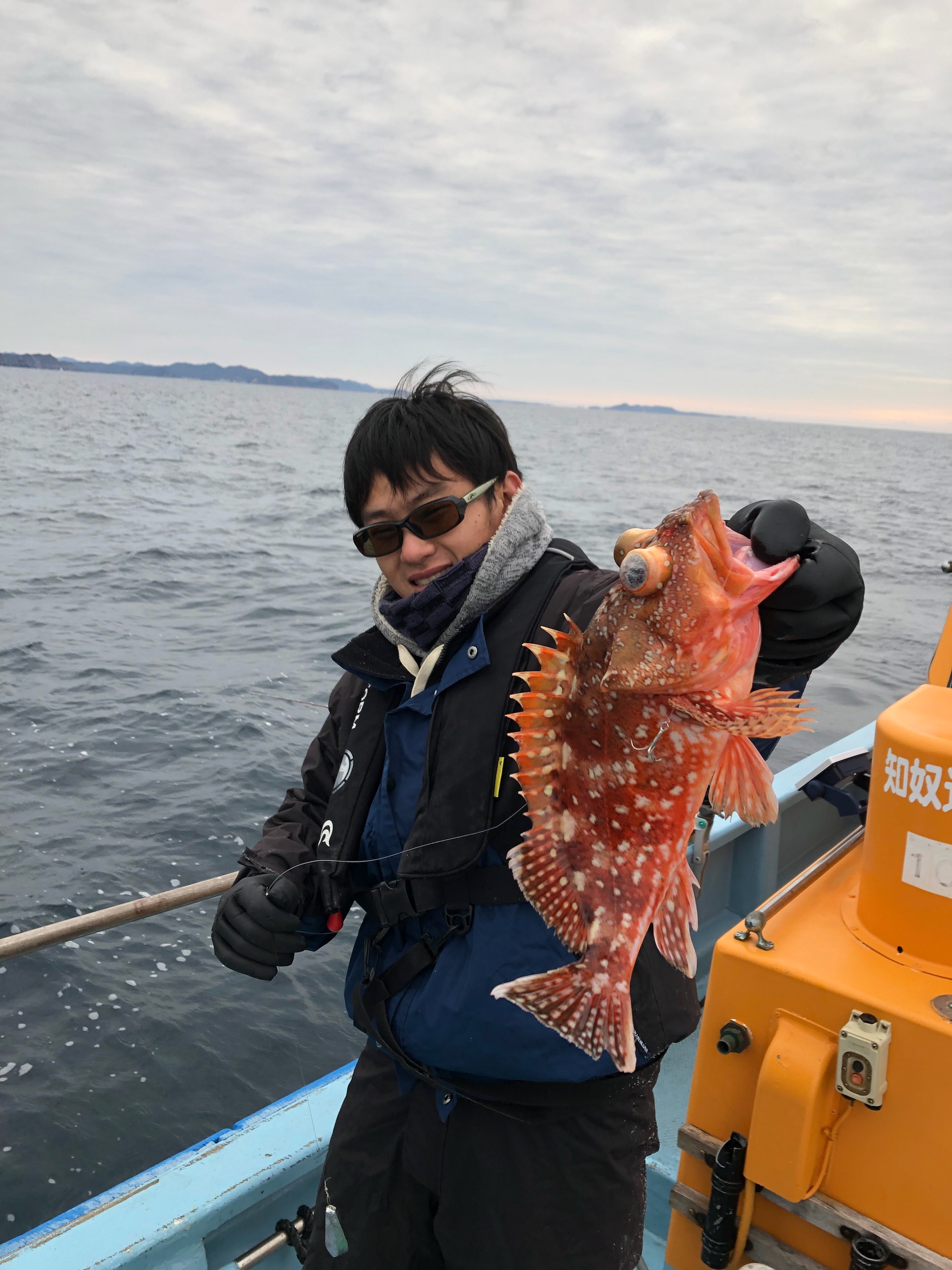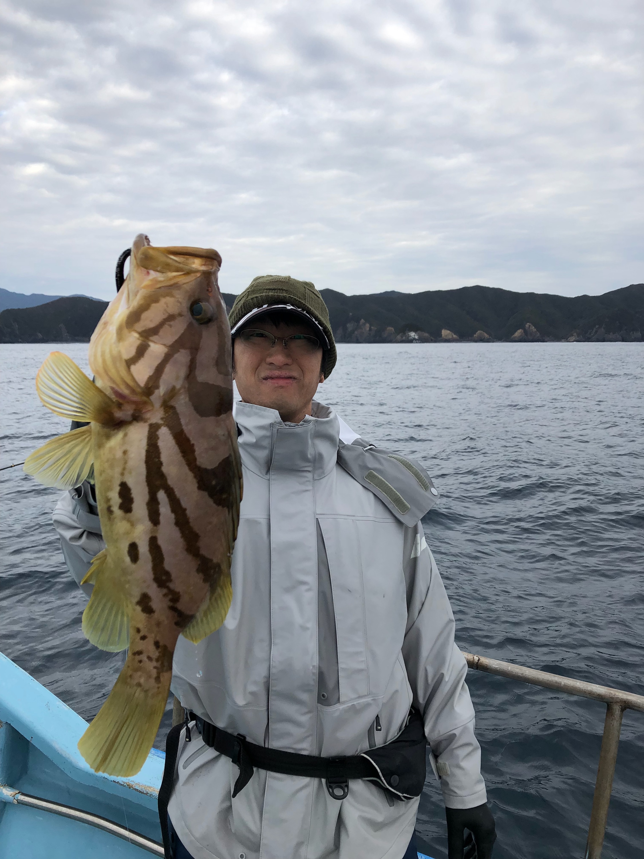 右舷側の2人には、アタリがあるようですが、私には全く。アジも暴れることなく、ただただ時間だけが過ぎてゆく。そして、ようやく2019年ファーストフィッシュは餌のアジよりも小さいサクラダイ…一体どうなっているんだ。終了間際にこの日最大のホウキハタをキャッチ。後日、住吉大社で大漁祈願キーホルダーを買ったので次回は安定の釣果になるかもーーー。