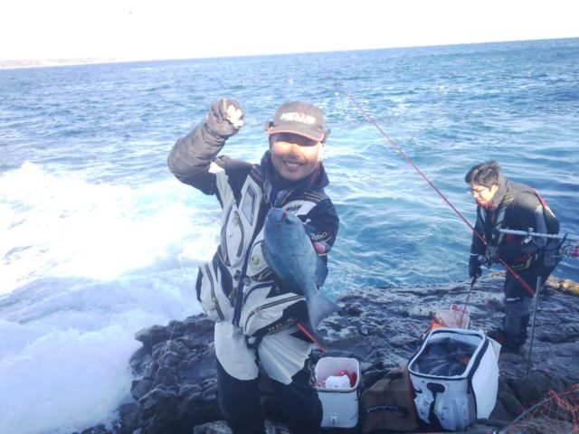伊豆遠征二日目となるこの日は無事渡船も出るとの事だったので、お目当てのシマアジを釣るべく意気揚々で船に乗り込みいざっ!今回渡礁したのは横根の裏本場1番という所前日からの強風と波が残っているのと、やや早い目の本流が走っているので先端部には釣り座を構えられそうに無く船着き場の周りで三人が竿を出す事に。それでも先端部を乗り越えてきた波が崩れ大きなサラシ場を形成しているので立ち位置によっては仕掛けを入れるのが難しい感じでした。で、実際釣り始めると30cm前後のイサギがエサ取りでコッパグレがポツリポツリといった感じ。それでもウキ下を2ヒロ前後で手返し良く楽しめるので夢中になって楽しんで釣っていました。小型サイズはリリースしましたが、それでもキーパーバッカンにどんどん溜まってくるのと時間が経つにつれマキエも効いてきたのか、昼頃からグレの型も良くなって35cm~40cmが混ざるようになってきてアタリも道糸をバチバチッと走らせる気持ちいいアタリを見せるようになってきた。結局シマアジは顔を見る事は出来なかったが、納竿まで良型のグレの数釣りができて楽しかったです。