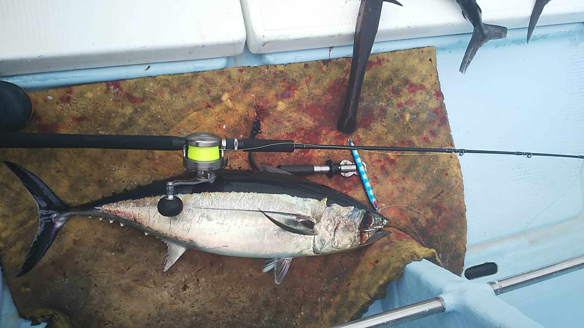 気を取り直して次の投入でまたもやヒット!プロトロッドをフルに曲げ獲物を追い込む。ほどなくして姿を見せたのは7、8kg位の本命ビンチョウマグロ!無事にタモにも収まりホッと一息。さあこれで気が楽になったので意気揚々でジグをポチャリ。ジャークも軽快にヒットを誘うと直ぐに答えが帰ってくる。シャーッ!二本目!!こちらは少し竿の曲がり等をチェックしながら余裕のファイト。こちらも無事ランディングに成功!同サイズのビンチョウをキャッチ!その後日が高くなるにつれタナが深くなったりはしましたがそれでもアタリ続け結局5本キャッチ。それ以上にバラシも多かったが次回への課題となりました。 タネトンクラスは次回またチャレンジするとしてこの好調の間にもう一度行きたい釣りとなりました。