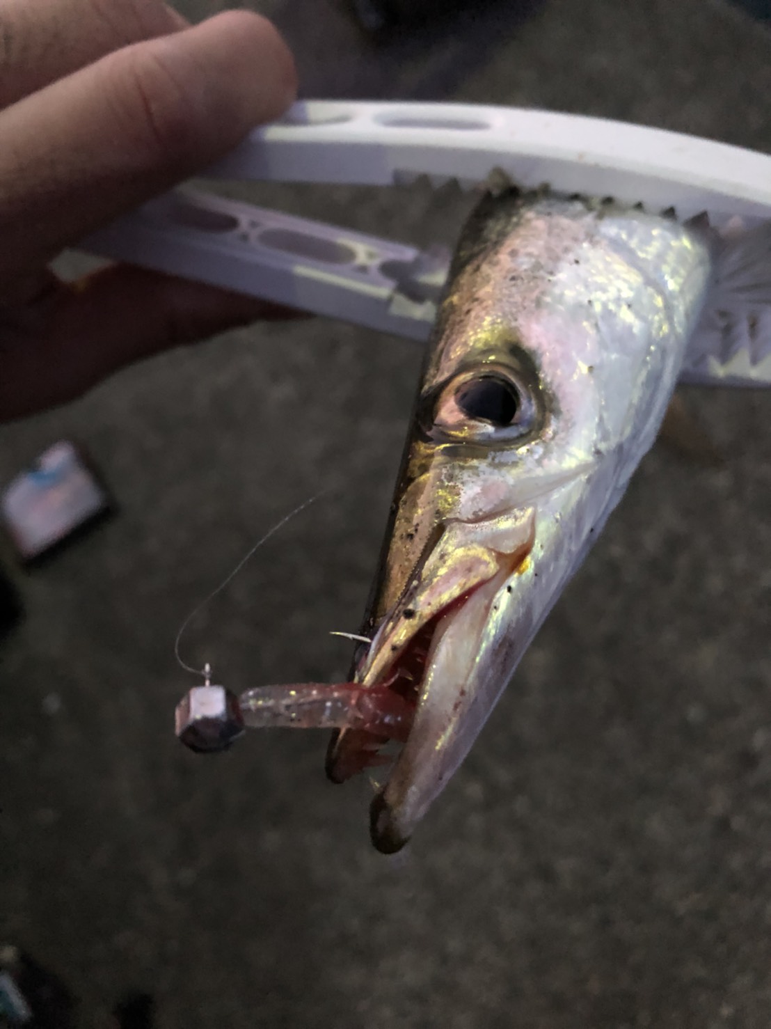 先日、尾鷲港にてアジングに行ってきました!干潮の時間にちょうど到着しましたが、夕まずめまでは、反応無し…6時ごろにやっと暗くなってきてボトム付近でカマスがヒット!同行した方は、エギングでかけるも惜しくも身切れでした。7時くらいになり、常夜灯が仕事をし始めると、表層でアジのライズが起こり始め表層タダ巻きで簡単にヒット!一定周期で釣れ続け釣果は、3人で27匹と楽しめました!その後は、カマス狙いで常夜灯のない暗い所へ移動、カマスも表層タダ巻きでヒットしますが、アベレージ40cmと大きくリーダー切られることがあったので、リーダーは1.5号くらいがおススメです。