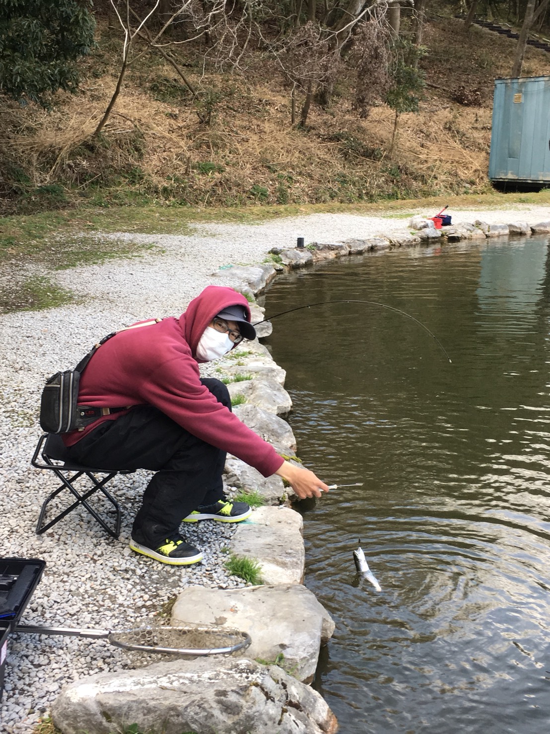 7時30分のオープンに合わせてサンクチュアリさんに入場し、第2ポンドに向かいました。すると雨が強く降り出し、小屋でしばらく雨宿り。小雨になり再開しますがなかなか魚がいる棚が掴めず、数が伸びません。自店の伊藤君はフォレストのフィックスマッチの0.7g中心のローテーションでボチボチ釣ってます。平岡君はセニョールトルネードのカラーローテーションで連発してます。ボトムを釣ると釣れますが連発しません。昼に安藤さんに話を聞くとこの時期になってくると棚が色々な状況でころころ変わるよとの事。昼から第2ポンドのポイントを変えてからは多少数が伸びました。なかなか状況が理解できないまま、エサ撒きタイムに突入!ペンタの1gとクローザーの1.1gのローテーションで数釣り出来て楽しめました。もう少し暖かくなり水温も上がってくると、水面からトップでも反応が良くなるようでした。