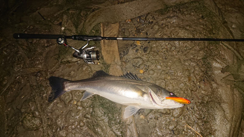 レスポンダー109を何度か投げるとヒットして55cm位のシーバスをキャッチ出来ました。