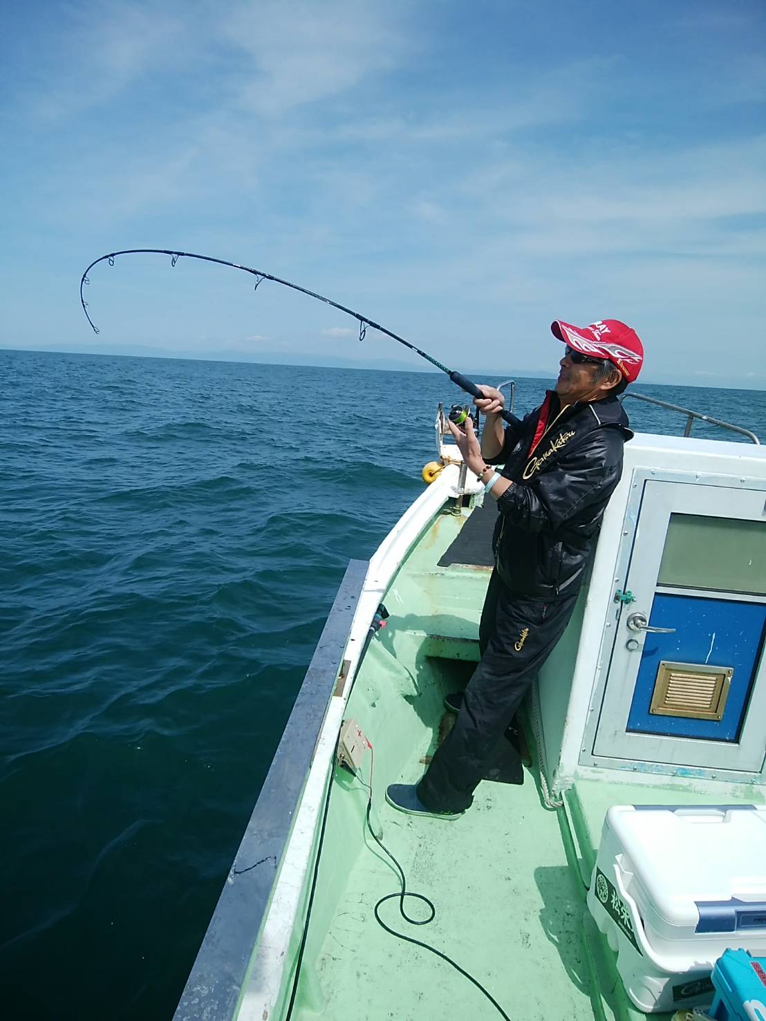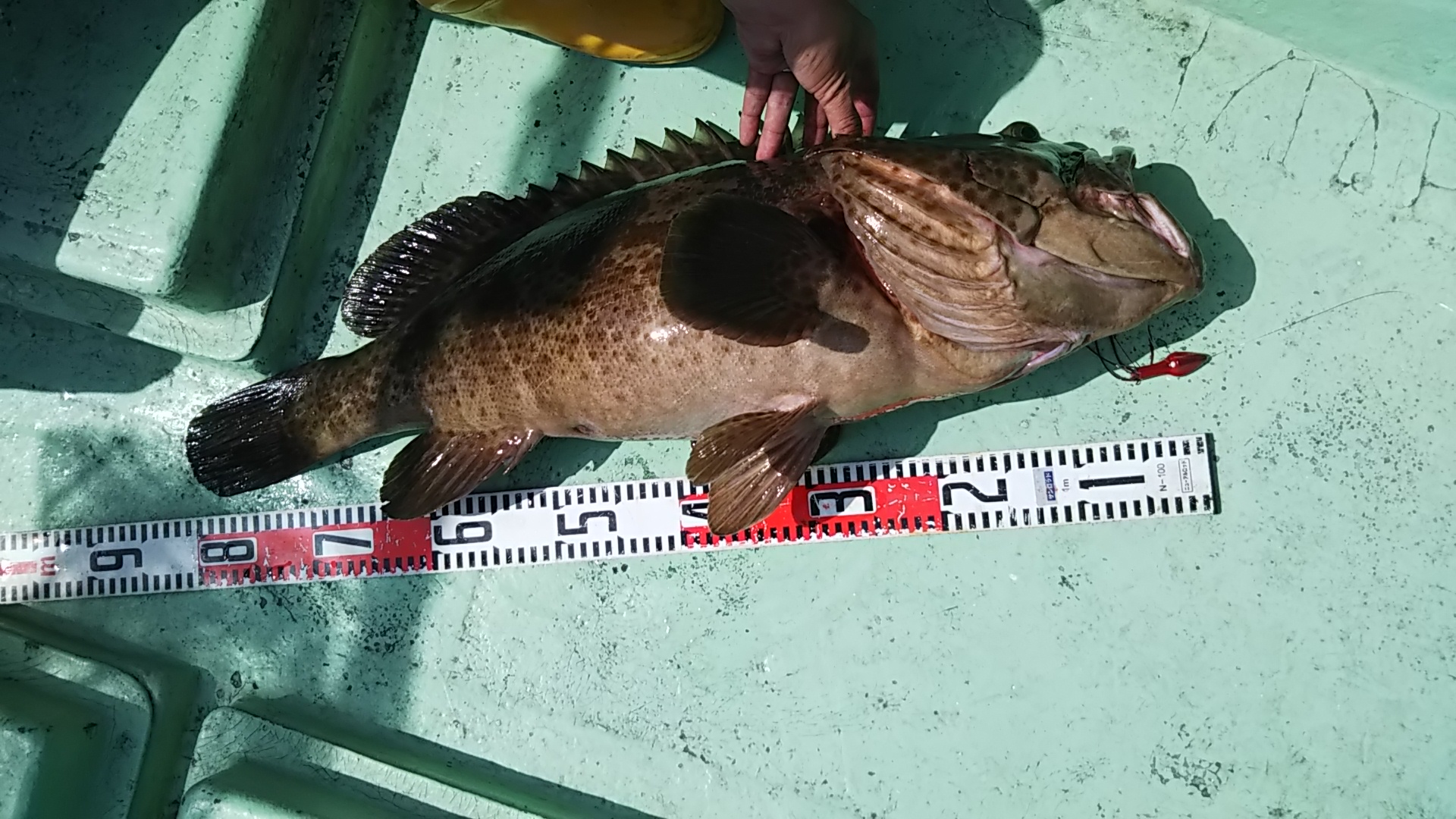 御前崎方面のタイラバ釣果をお聞きしていたところ、乗っ込み後?なのか、細いネクタイではなく、ボリュームがあるネクタイや、ワーム等、大き目のシルエットにバイトが集中していたとのこと。最近、タイラバの釣果がもう一つ盛り上がりに欠けていたため、それを確かめるべく、焼津沖へタイラバ釣行に行って参りました。しかし、船からの目線よりも高い位置から壁が時折押し寄せるようなウネリ。。。幾分収まっていく予報に出船時間を遅らせてのタイラバを始めました。が、潮があまりなく、ネクタイを替え、ヘッドを軽くしてもほぼバイトがない状況でした。そこで富永船長は大井川沖近くまで大きくポイント移動します。不覚にもその頃私は目が回り始め戦意が下がりつつありましたが、それでも深くなった水深に合わせでヘッドを重くして再開します。ここでも潮は動かず、次の移動でキャストをしようと、キャスティングロッドに1.2号のPEラインというアンバランスながら、紅牙キャスラバ60gをセットして50mほど正面へキャストします。その3投目、ゴンゴンというファーストバイトに続いて、あっという間にに80m近く走られ、一気にドキドキです。慎重にゆっくりと10分?15分ほどで取り込むと、船べりで浮かんだ魚体にビックリです。82cm、9kgのチャイロマルハタ(後調べ)でした。マダイはノーヒットでしたが、思わぬビッグワンはメモリアルな一本となりました。