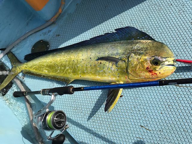 思っていましたが撃ってみると、どん深。バイブを投げても着底する気配が無いのでミノー1本で巻き通すと決めサラシを撃ち続けるとゴンッ!フッキングを決めるとジャアアアンプッ!!!!サラシの中から80cmのシイラが飛び出してきました!その後それらしいアタリがあるも乗らず….リベンジ確定です!