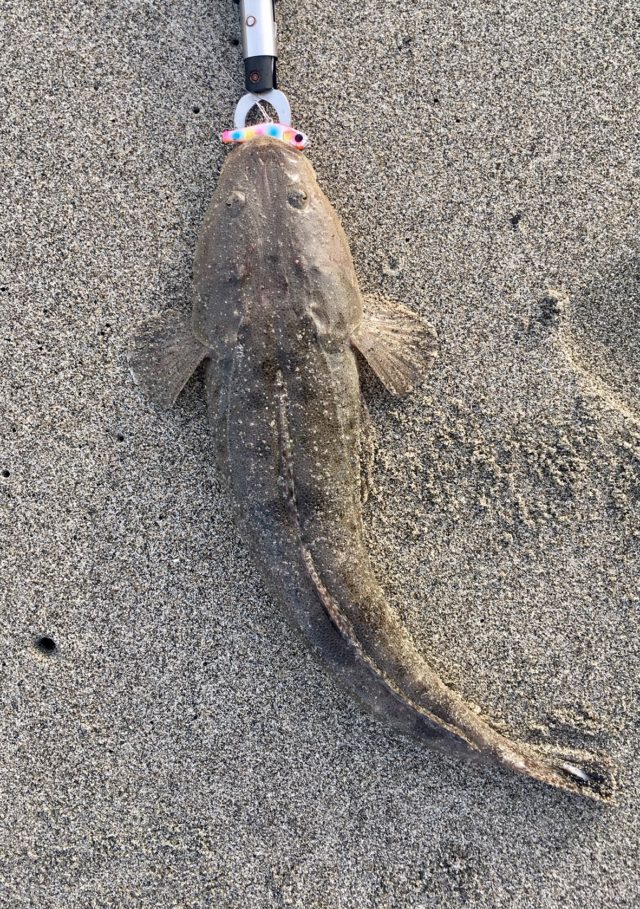 今日は望み薄かなーと思い、来た道を戻りつつ、食い気のない魚のリアクション狙いでバイブレーションを投げていきました。すると、ものの数投でルアーが引ったくられました!首を大きく振る独特な引きに耐え、50アップのマゴチをゲット!!