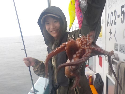 連日好釣果がでている常滑のさくら丸さんにタコ釣りに行って来ました!平日&雨にもかかわらずほぼ満船でした。屋根つきなので雨でも快適に釣りが楽しめるのが嬉しいですね。トイレもキレイなので女性の方は嬉しいのではないでしょうか?1投目から船内はヒットの連続!しかし1流し目は当たらず少し不安になりながらも誘い続けると竿先が重くなるアタリが!!良型のタコをキャッチできました!そこからはコツを掴み、1流し毎に1~3杯釣れてくれてます。今回はタコエギを2個にカワハギ用集魚オモリ30号をタコスナップで接続して使用しました。デュエルのパタパタを3本付けしている方がめちゃくちゃ釣ってましたよ!