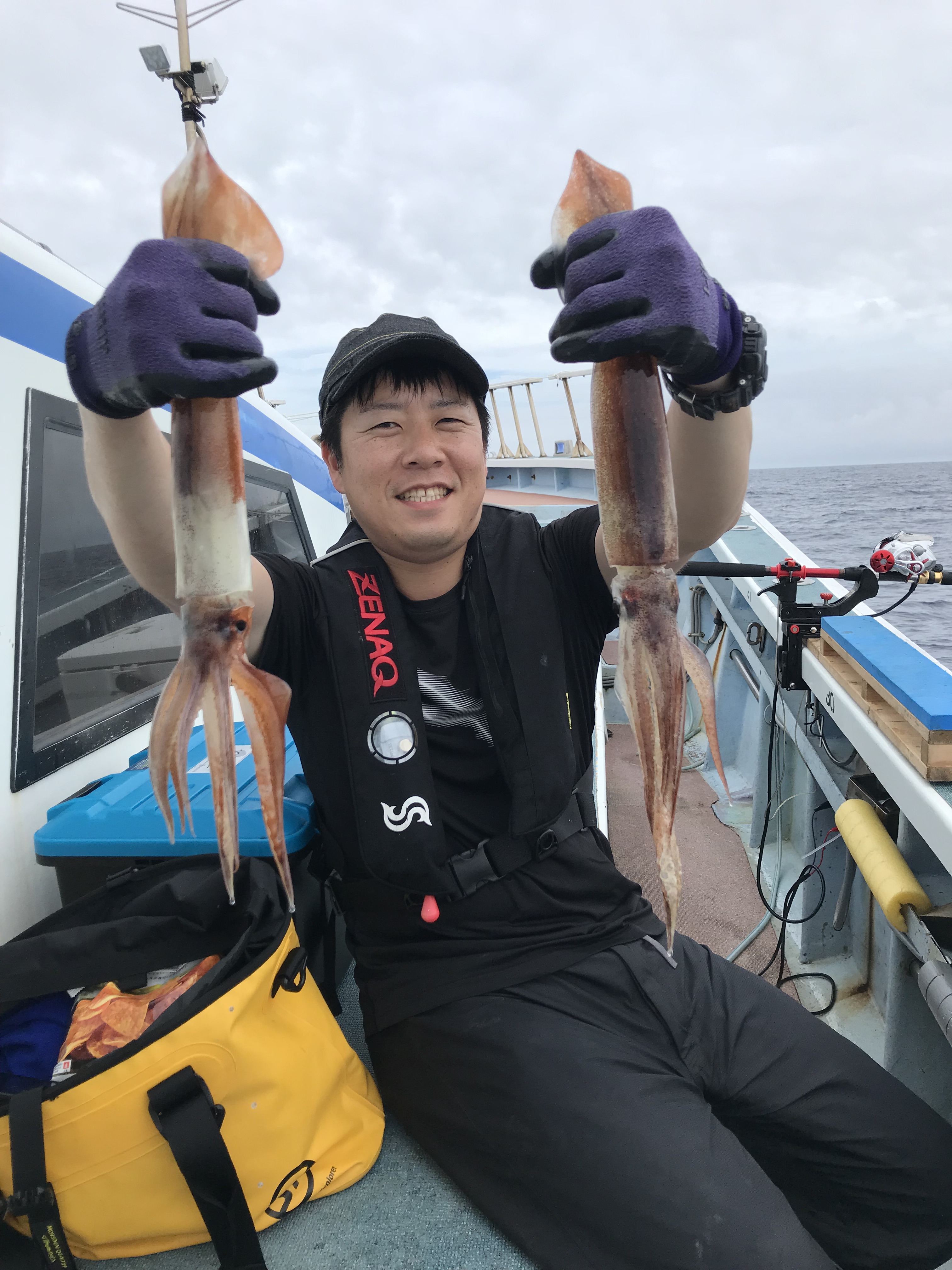 出船前に準備をしていたところ、大進丸の常連のお客様から仕掛けの投入の仕方や回収の仕方などをいろいろ教えてもらい出船。水深300m、オモリ250号、遊オリジナル仕掛け6本針。まずは船長の指示棚まで落とし大きくシャクリ糸を巻き取ります。初めの2流しは船中アタリなし。ポイント移動後指示棚まで落とすとスルメイカから反応が‼2,3回シャクルとずっしりとした重量感が竿に乗ります。電動で巻き上げた後は、糸のテンションが抜けないように取り込み。テンションが緩むと水面でイカがバレてしまいます。その後は次の投入に向け、仕掛けが絡まないよう準備。すると船長から指示があり投入。そこから1時間ぐらい連発モード‼休憩する暇がなく体力勝負です。フォール中にどんどんアタってくるので楽しめます。爆釣タイム終了後は少し沈黙しましたが、ラストにまたいい群れにあたり連発。私の釣果は53ハイ。常連さんは150パイとさすがです。今が旬の大山沖スルメイカ!おすすめです‼