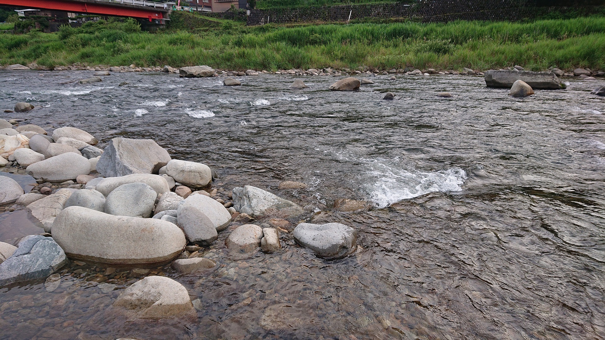 遠征二日目を迎えました。朝、天気予報を見ると午前中雨で午後から曇り予報でしたが、宿泊先から出ると晴れ間が見え始めました。同行のお客様が晴れ男らしく天気予報が変わってしまいました。天気が良くなれば釣り易くなりに決まっています。期待に胸を膨らませ、前日の上流部にあたる小屋名橋周辺に行ってみましたが、先行者の方がいっぱいおられたので前日同様の柳橋に入る事になりました。掛かったおとりが弱かったので、同行のお客様に釣りたてのおとりを分けてもらったり、レクチャーして頂きましたがぱらぱら掛かるくらいで、晴天にも関わらず大苦戦・・・結局前日同様の7匹しか釣れず不完全燃焼に終わりました。しかし、鮎釣りの先輩方と二日間過ごす事ができとても勉強になった遠征釣行でした。釣果はともあれ楽しむ事が第一優先です。静岡の河川で修行してまた来年リベンジしたいです。
