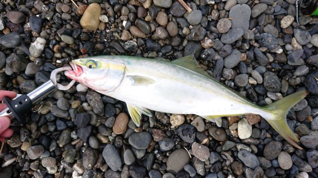 静岡サーフはここ数日低気圧の影響で波が高い状態が続き釣りが出来ない方が多いのではないでしょうか?この日は強風北東4m予報で、波は2.5mうねりを伴い高潮警報が出ていました。朝、サーフを見に行くとどでかい波がテトラにかかっており命の危険を感じる海況・・・こんな時は無理にやらない方が良いです。場所を変えて、清水港でマズメ時にタチウオと青物を狙いました。リジェット30gをボトムから巻き上げ、誘いますが無反応・・・ふと三保の北東風に強いポイントを思い出しました。再びサーフに入るとすっかり明るくなっていました。しかし、読み通り波無し、風は後ろからなので微風で釣り易いです。リジェット30gをフルキャスト。カウントは20ちょっとでしょうか。これだけ深ければ、色々な魚を狙える予感。しかし何度キャストしようが、手前で群れているベイトがあたるだけ・・・8時過ぎまで粘りましたが、何も無く集中力が掛け始めたので、帰り際にシャローのポイントでフラットを狙ってダメだったら帰ろうと、移動しました。ぶっ飛び君をフルキャストし、広範囲に攻めました。すると、8時半過ぎ突如として手前でボイル発生!!ルアーをジグに替え、表層をただ巻きすると1発ヒット!!良く引きます。上がって来たのは、ワカシ35~40cmでした。急いで外してリリースしようと思ったら魚が首を振った瞬間、ジグのリアのトレブルフックが薬指にぐさり!!!青物はリリースしたかったので前も後ろのフックもすべてカエシを潰し、バーブレスにしておいたので、すぐ抜くことが出来ました。冷や汗が出ましたが、痛みも無く幸いでした。青物狙いの時はフロントのシングルフック1本しかもバーブレスだけでも良いのですが、バラシたくないので、前シングル、後ろトレブルをバーブレスにするセッティングにしています。気を取り直して、ボイルをやっている付近に入れるとアタリます。しかし、2回ヒットしましたがバレてしまいキャッチには至りませんでした。ベイトはイワシや20cm超えのコノシロのようで、ルアーを引くとコノシロがコンコンあたりますので群れていると思われます。ボイルは30分以上も続き、アタリ多く強い引きを堪能し楽しめました。いつもやらない時間まで粘っていた甲斐がありました。コノシロの群れがいるので、大型青物やシーバスなど時間帯や回遊のタイミングにより狙えるかもしれません。