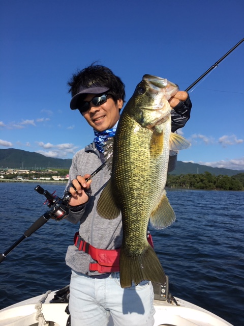 少し上向きにキャストしてウィードを突き抜けさせて底まで落とす釣り方を教えてもらいました。かなり難しかったので、移動して3/4オンスのパンチショットにかえました。ピッチングも教えてもらいましたが、やはり慣れてないので時々バックラッシュしてしまいました。モタモタしている間に同乗の中島副店長は40くらいのバスを釣ってました。