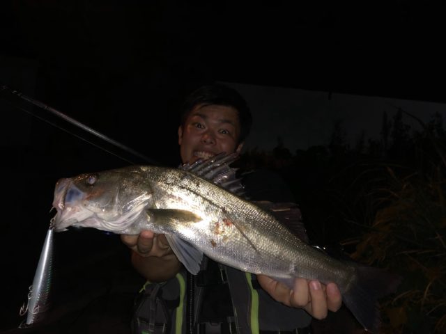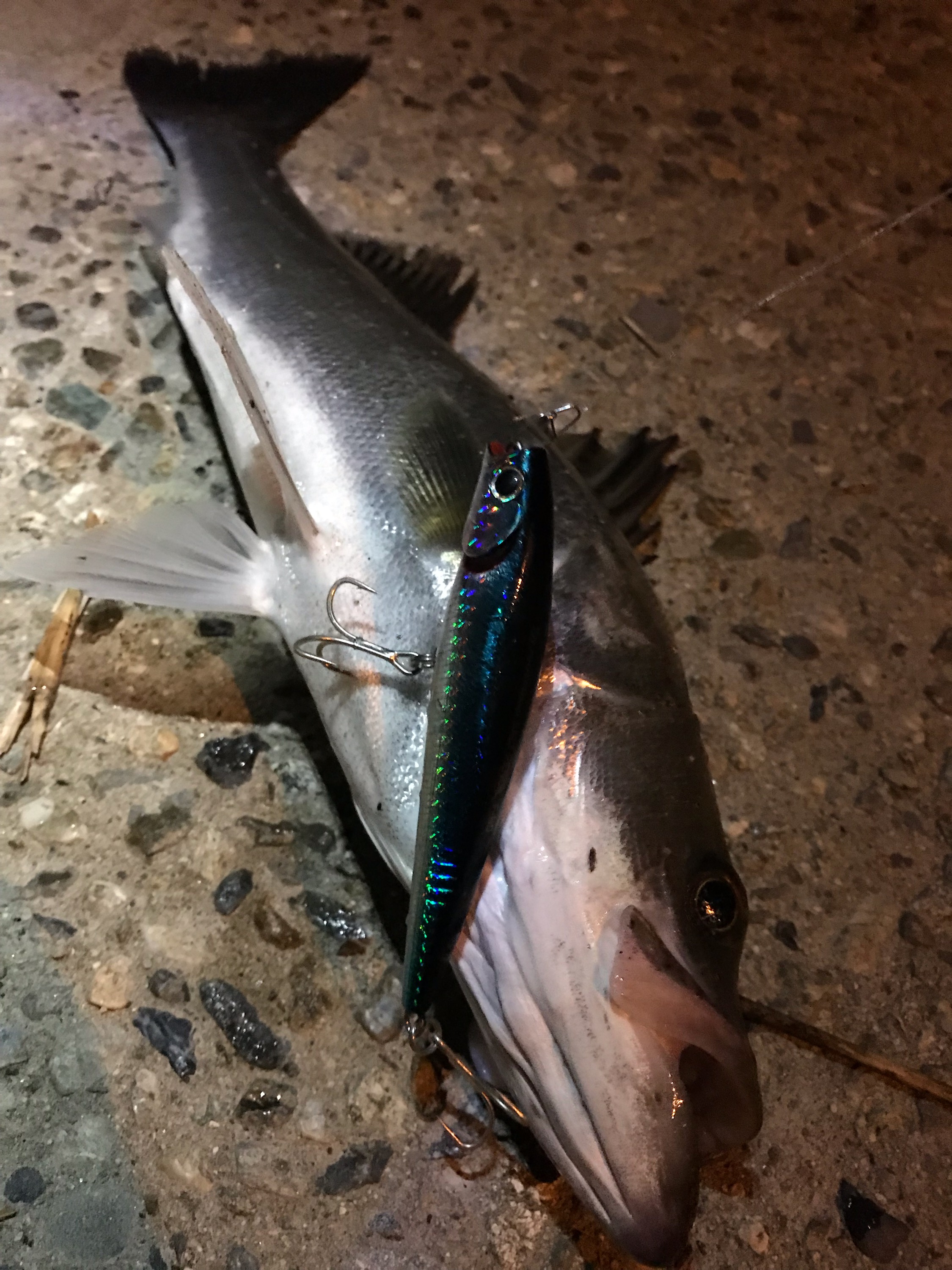 こんにちは!ごりちゃんです。今回も仕事終わりにさくっとシーバスです。前回と同じポイントに入りますが、下げ止まりぎりぎりで水量少なめ…。まずはマニックフィッシュを投げますが反応無し。流れが全く効いておらず、だらーんとした感じ。これは厳しいかと思いながらもあれこれやってみる。ミニエントに変えたり、ワームも投げてみますが無反応。40分程経った時に少し流れが出始めて、フェイキードッグを投げますが少し流れすぎる感じなのでモアザンペンシル125Fに変えてアップストリームに投げてドッグウォークさせるとドンッ!水量がかなり少なかったのが幸いしたのか、いつも通りのトップで45cm程のシーバス君。その後はマリブをドリフトさせたり、色々やってみますが無反応なので終了しました。1本を絞り出すシーバスも楽しいですね!