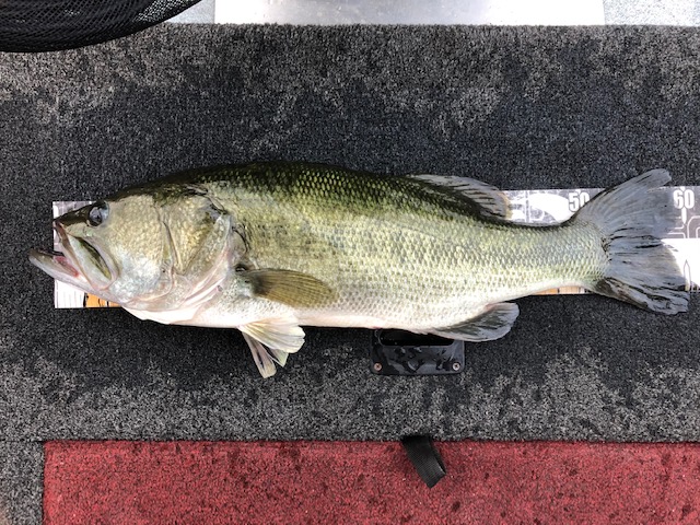 先日琵琶湖に来た際にあまりにも今までと状況が変わっていたので、今回は1人で修行してきました!まずはI字とディープのミドストの練習からスタート!水深は4~8mのベイトが群れている場所を念頭に探してみるとすぐに発見!ジグヘッドにデスアダー4インチをセットし丁寧に誘っているとすぐに反応が!!しかし釣れてくるのは20~25cmの小バスだらけ…。3時間以上頑張りましたが、耐えれませんでした!日も上がったので西岸の魚探掛けに!4時間ぐらいうろちょろして、ざっくりと把握できたので試し釣りしてみます!ベイトの多いウィードエッジだけに絞ってアラバマを巻き巻き。するとグッと抑え込むアタリが!!上がって来たのは40cm程のバス!さらにさらに!!同じようなアタリからの強烈な引き!!!デカい!!慎重にやりとりし、無事にゲット!サイズはなんと60cm!!魚探掛けに時間をかけた甲斐がありました!!リベンジ達成です!!