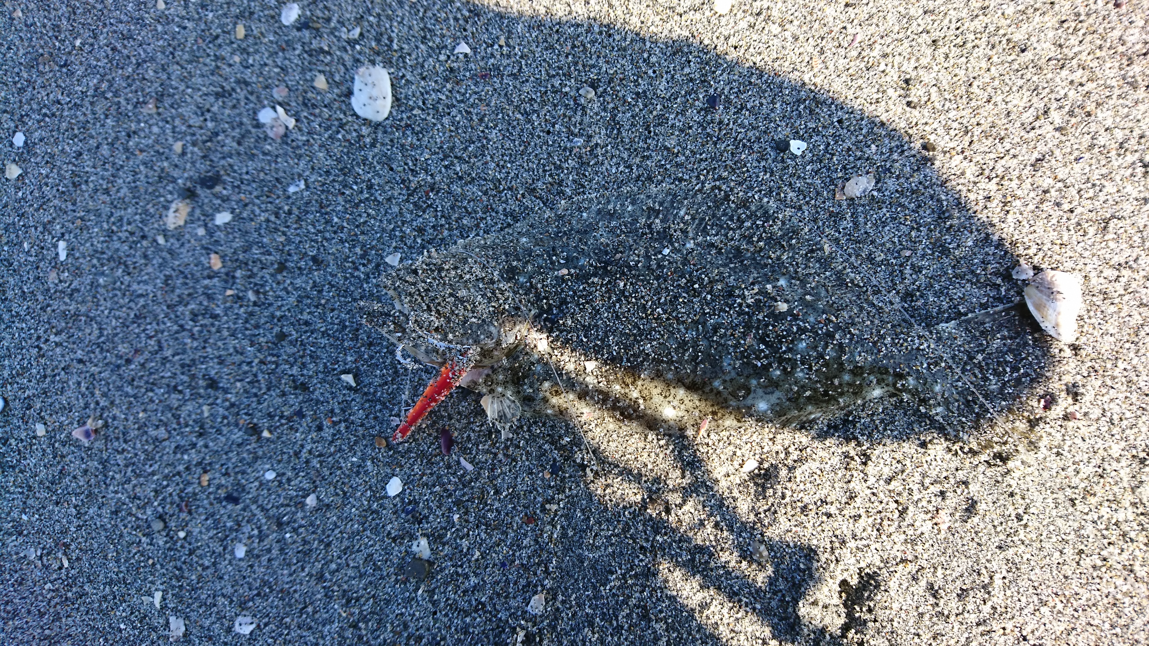 11月5日に静岡県の新居のサーフへヒラメ釣りに行ってきました。当日は朝2時30分に出発し、4時過ぎにはポイントに到着。まだ真っ暗ですが釣り開始~まず釣れたのはフグ・・・その後もフグ。6時過ぎにようやく明るくなり、ポイントには鳥も飛んでベイトも確認できていい感じ。人が多く移動も出来ないのでそのまま釣り続けていると7時30分頃ソゲがHIT。その後も9時過ぎにソゲを1枚追加追加し10時過ぎに納竿しました。HITルアーはDUOのハウルシャッドとDUOのフリッパー40gでした。私の周りでも35㎝くらいまでのソゲが3枚釣れていました。