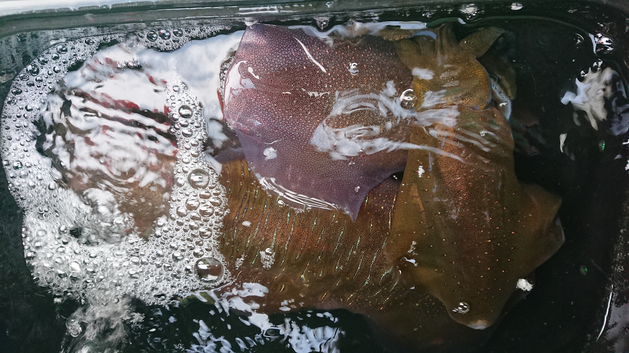 乗船したのはなぎさ丸さん。去年もお世話になったので、期待が高まります。開始は湾内のポイントから。去年好調だったポイントですが、全く反応なし。イカを求めて湾外へ移動しつつ転々と攻めていきます。ちょっとヤバげな気配を感じつつも、止の鼻付近の水深15mくらいのポイントまで移動したところで、プチフィーバーに遭遇。船中ほぼ全員イカを確保で一安心です。何度か流し直してくれたので、自分も何とかリミットの3バイを捕獲しました。その後はサイズアップを狙って移動を繰り返し、最終的に西の 水深45m前後のポイントへ。1キロクラスを交えつつ、ポツポツと追加でき、最終9ハイの釣果となりました。