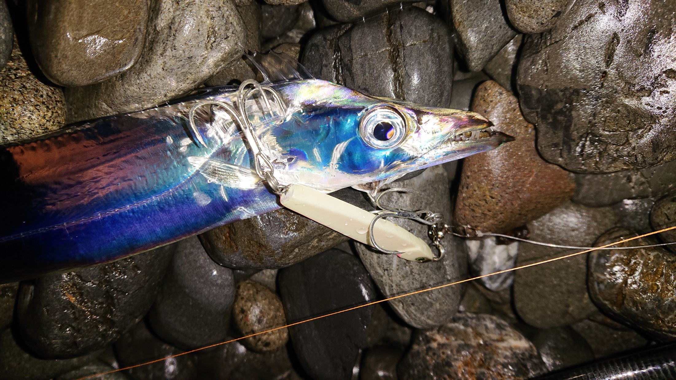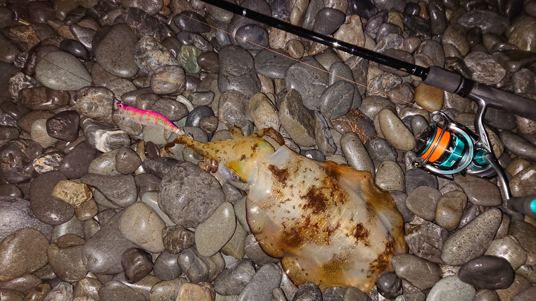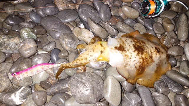 仕事帰りにサーフに行って来ました。狙いはアオリイカとタチウオです。まずはマグキャストでアオリ狙いです。キャストして着底したら3回しゃくって5秒フォールの繰り返しで誘いました。反応は早く、1投目でヒット!ずっしりと重い引き、ゆっくり慎重に巻き上げてキャッチ。600gジャストでした。1杯釣れて満足したので、次はタチウオ狙いです。HPBブランカ28gに替え、5~10カウントレンジをゆっくりアクションさせて来るとヒット!大きさは小ぶりで指2.5本でした。その後数投しましたが反応無く納竿しました。タチウオはなかなか群れに当てる事が出来なく数釣りが難しいですが、潮のタイミングや対象魚が狙い通りになり満足の釣行でした。