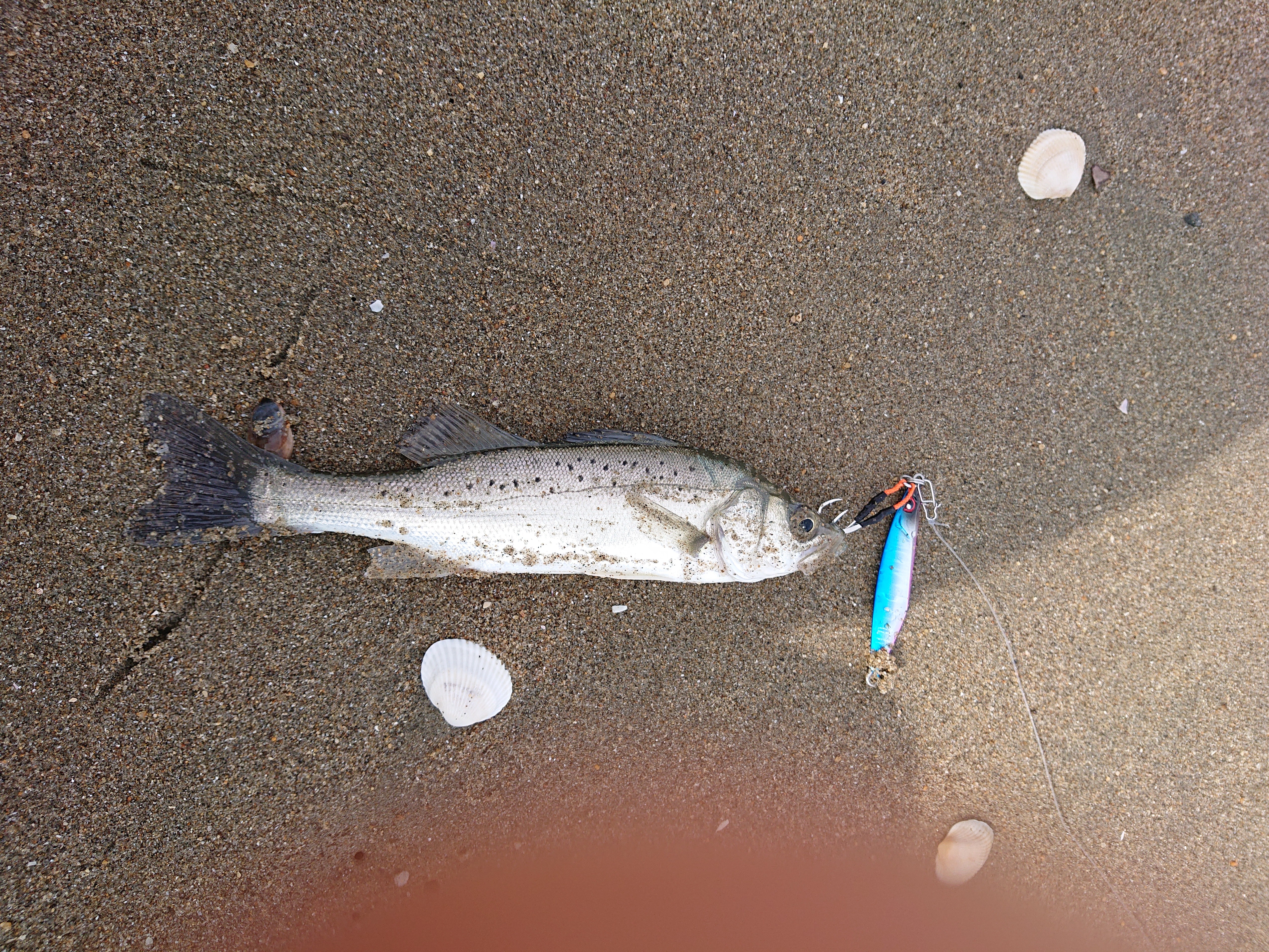 今日はお休みだったのでシーバス釣りへ!早朝はサーフで青物も混ざらないかなーと20gのメタルジグを投げると小さなシーバスが一匹ほど。青物のナブラは200m先でバチャバチャしていました。まだまだ青物は好調のようですが、目的のシーバスはいなさそうだったので、家に帰りました。そして、夕方の満潮からの下げ3時間後くらい、ポイントにつくとボイルがバチャバチャと!パイロットルアーはメガバスのゲンマ!上流に投げて、流しているといきなりバイト!でも痛恨のバラシ。(悲)そこからボラのアタリが頻発したので、少しだけポイント移動しました。その後、シーバスが表層近くを意識しているようだったのでカゲロウにチェンジ!そして、一投目からアタリが!