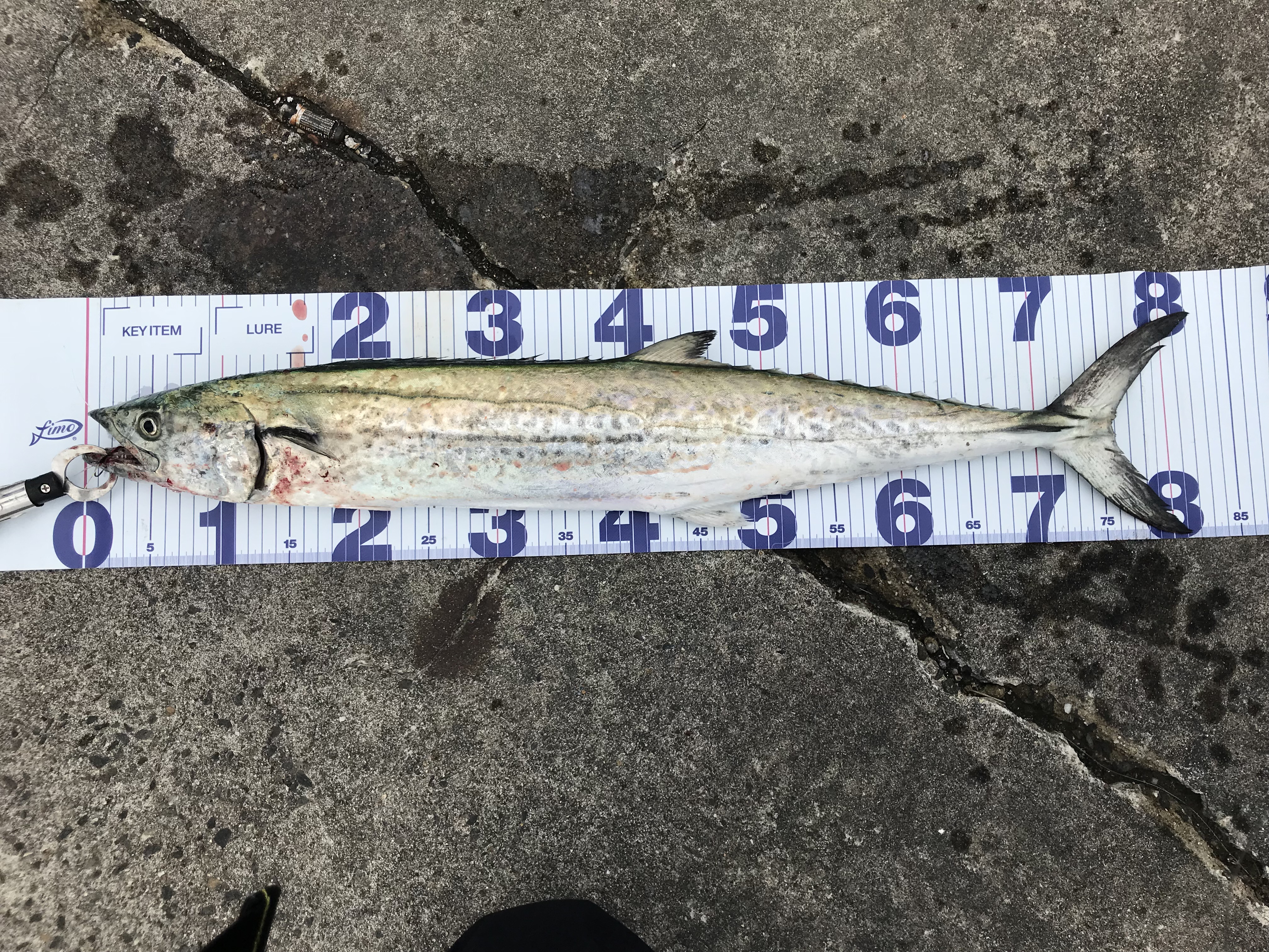 この日は台風の影響で風が強く、その為かナブラの気配もありません。一瞬ではありますがベイトがざわつくのを確認したのですが、自分の位置からでは届かない。2時間ぐらいしたところでアタリがあったのですが、やりとりの最中にバラシ。その後すぐにアタリがあり40cmぐらいのハマチが釣れたのですが抜き上げ時に空中でオートリリース。今日はもしかしたらダメなのか?と思いましたが10時まではと信じてキャストを続けます。そしてついに待望のヒット‼先程の40cmのハマチとは比べ物にならない重量感。手前まで寄せてからも走る。まだ姿を見ていない私はドキドキしながらやりとりし、ようやくネットイン。83cmのサワラでした。ヒットルアーはロンジン ブリード30gでした。時間は朝10時ぐらいでした。満足した私はこれで納竿としました。