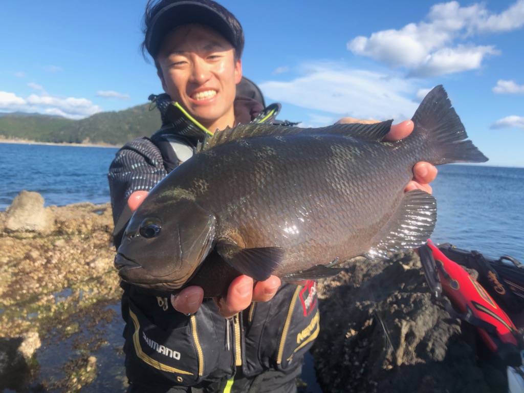 朝一は満潮でしたので、足場の低い今回の磯では釣場が限られており、向かいから朝日が眩しくてウキはまったく見えません。糸を張りぎみにして流していくと1時間後くらいから魚の反応が良くなりだしポツポツとグレも釣れ出しました。一番いいサイズで30センチくらいでしたが、同じ磯にのった野田君は40センチ近いグレを釣り上げていました。さすがです!!