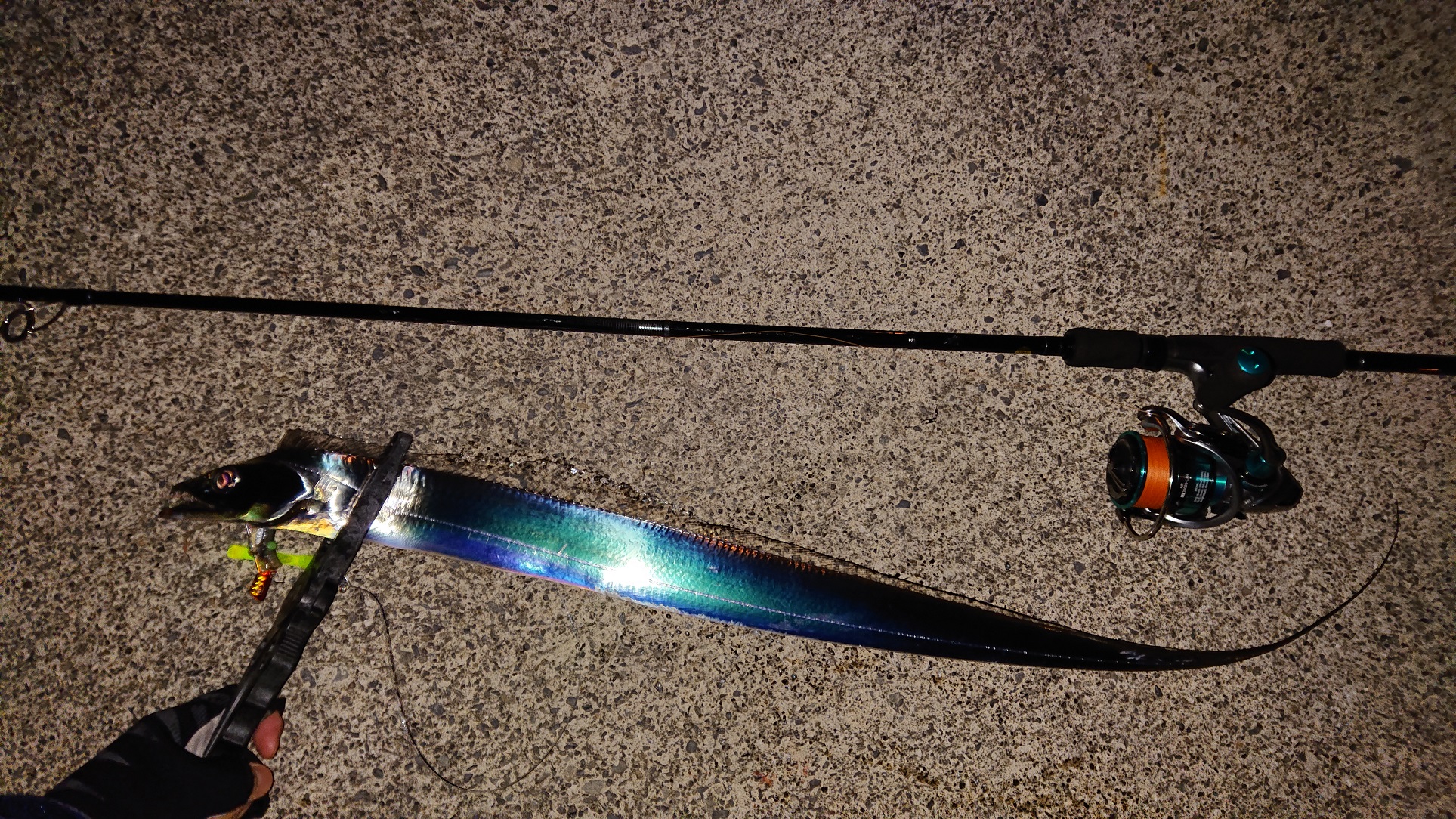 仕事帰りにタチウオ釣りに行って来ました。本日は土曜日とあって多くのお客様で港が賑わっていました。風が強くタッチポン陸6.5gを使いました。カウントしてレンジを探ります。まずは表層でアタリましたが、これは尻尾を食われて終わりました。開始から20分くらいして、0から5カウントで巻いて止めて巻いて止めてとゆっくり誘ってくると沖の方でガツガツとアタリが!!しかし、乗り切らない・・・そのままデットスローで巻き続けるとまたさっきの魚?がガツガツと食ってきてフッキング!!きました!とりあえず1匹釣れ安堵。その後も手前の明暗でアタリはあるものの針掛かりしません・・・。食われたきびなごを見ると丸い歯型。フグが手前に群れているのかもしれません。その後は釣れず納竿しました。