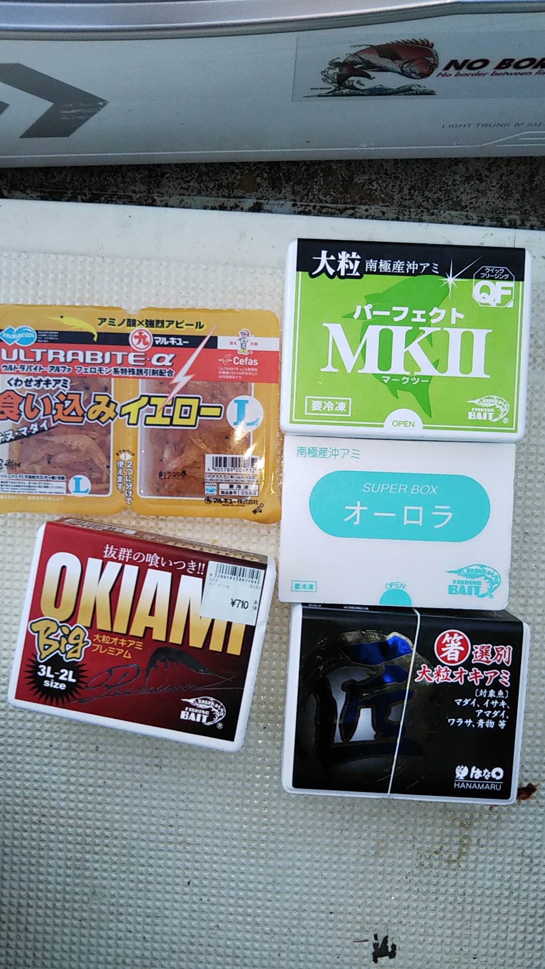 午前6時過ぎ、まだ薄暗い焼津小川港を出船し、30~40分程でポイント到着。さっそく釣り開始です。今回は、個人的に「いったいどのオキアミがアマダイに効くのか?と、付けエサをたくさん用意し、同行した方々にも少しずつ使用してみて頂きます。