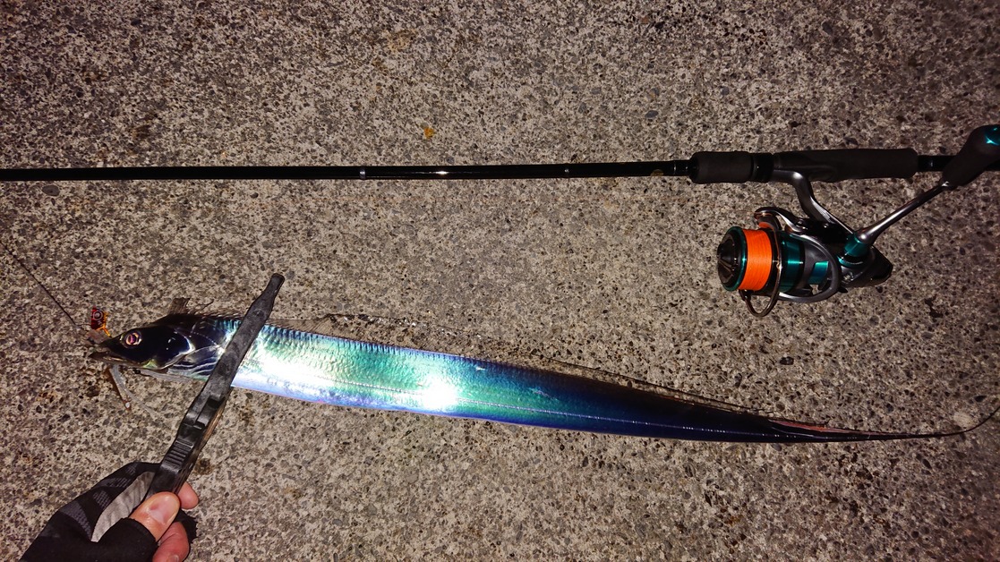 仕事帰りに焼津港に行ってきました。ここ最近全然釣れなくてボウズばかり・・・試行錯誤で今回はエサを変えてみることにしました。1日の日に三宅商店様のイベントをやった時に、エサはきびなごやドジョウの他にサンマを細く切ったものも使えると教えて頂きました。臭いの強いサンマであれば渋いタチウオも攻略できるのでは?と思い、この日はサンマを試してみました。タッチポン陸6.5gをキャストしてカウント5でゆっくり巻きました。フグにかじられまくりでしばらく経ってようやく沖の方でヒット!最初の押さえ込む引きはたまりません。無事に抜き上げキャッチ!あまり大きくありませんが久しぶりに釣れ感無量。そのあとは何も無く納竿しました。