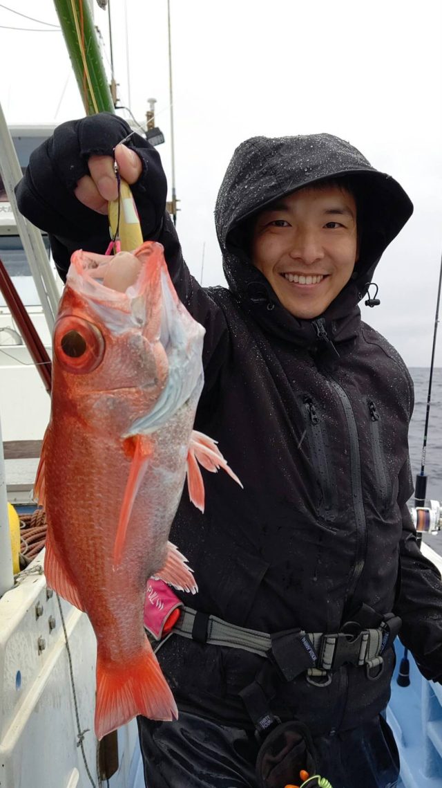 再びジグを落とすと先程の場所より潮が緩く、シャクった分だけジグが動く感じだったので、より丁寧に探っていると、ギンメダイがヒット。この魚がきっかけで、アタリを出せるようになり、すぐにドンコがヒット。