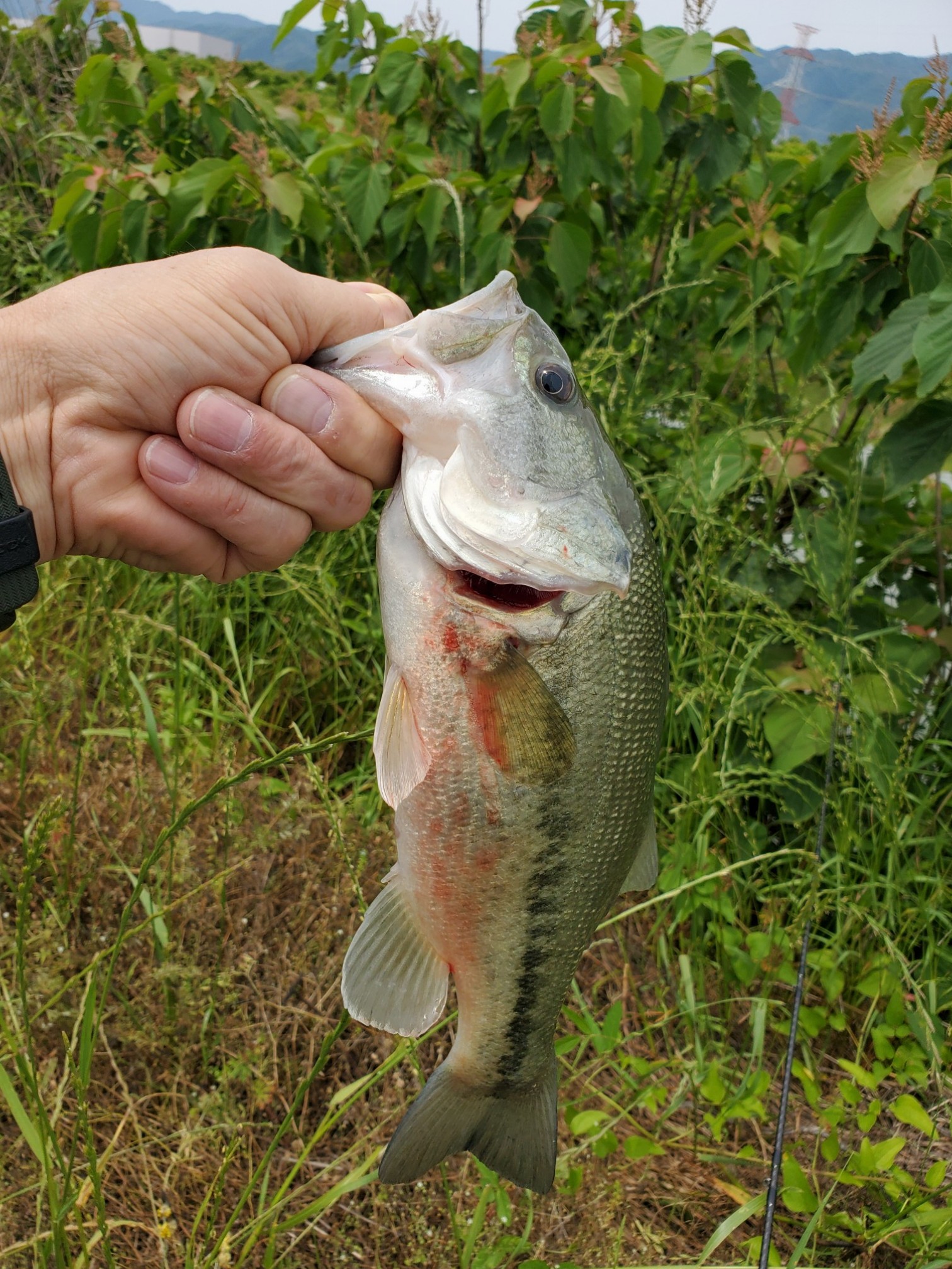 最近は、平日といえどアングラーが多くプレッシャーが高いのかブルーギルのちょっかいもなく1時間ほどがすぎ蒸し暑さに我慢ができず一休みしてから、購入してから一度も使ってなかった(笑)ジャスターホッグ3.3インチのグリーンパンプキンで最近全く使っていないテキサスリグを投入・・・すると、なんとアタリが・・・一呼吸入れてフッキング!ギューンと心地よい引きを楽しませてくれたのは30㎝の元気なバス君でした。ニューロッドには幸先の良い結果となりました。