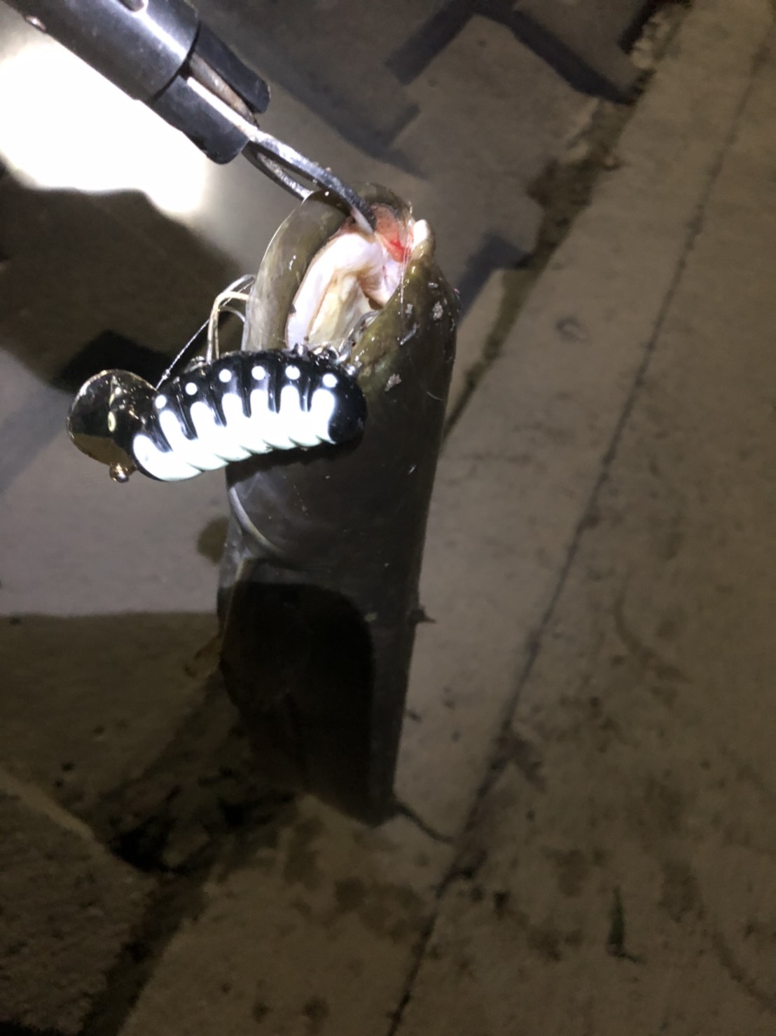 仕事終わりにナマズに行ってきました!ルアーはキャタピー。川の岸際に投げては巻いてをひたすら歩きながら打っていきます。パコパコパコ、、ボゴッ!手元でボゴッ!なかなか乗りません。スタッフ参戦で、でんぐりガエルにルアーを変更。フロントフックはジグ用アシストフック、リアフックはスイベル噛ませて長くしたりとフッキングしやすいようチューチングしています。通いまくっているスタッフはすぐに1匹釣っていました。アドバイスしてもらい流れ込み周辺に落としてボゴッ!乗った!62cm程のナマズゲット!!解散後流れ込みにキャタピーで1匹追加!迫力満点バイトで楽しめました!
