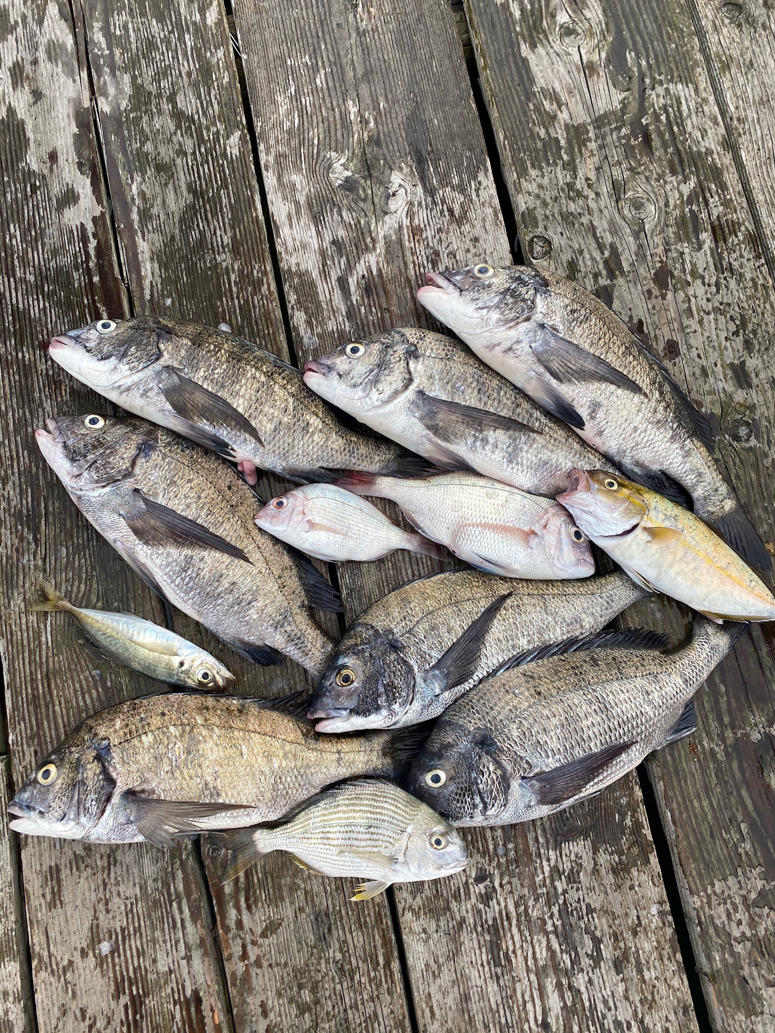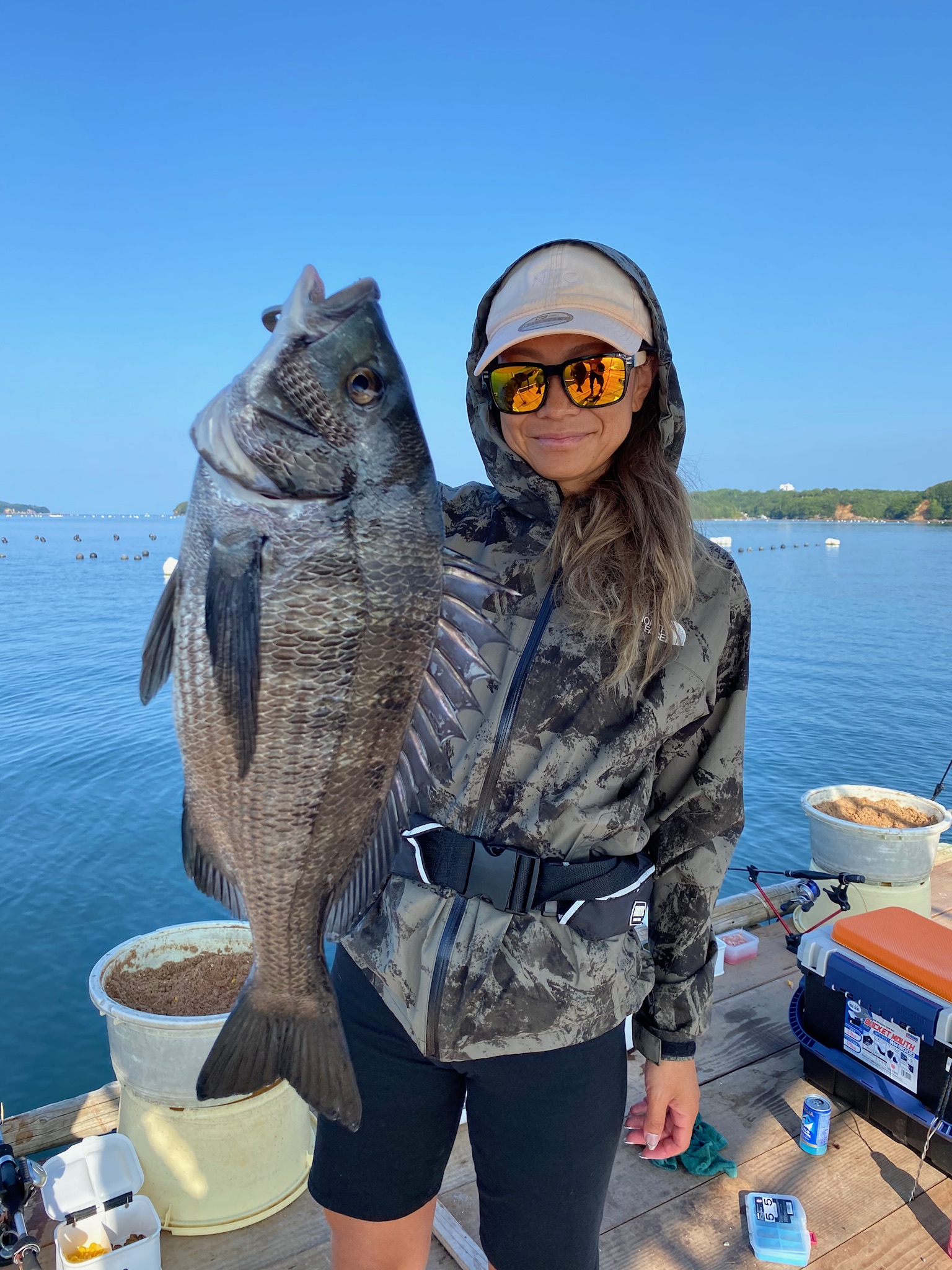 今回は三重県志摩市大崎筏釣りセンターさんにお世話になり、筏釣りに行ってきました。メンバーは私と妻。妻は昨年まで筏五目釣りで楽しんでいたのですが、今年からはダンゴでクロダイ狙い。朝から魚の活性は高く、水面下ではサバ、ツバス、グレ。見てるだけでも楽しくなります。準備を済ませ、朝のジアイで38cmのクロダイ。1時間後に妻の竿が大きく曲がり、44cmGET。エサはどちらもオキアミ➕コーン。その後はエサ取りが多く、風も出て釣りにくくなりましたがコーン2個付けに40オーバーがコンスタントに釣れてくれました。エサ取りが多い今の時期はコーン、サナギが大活躍。釣果は私は38〜42cmまでを5枚。妻は41、44cmの2枚。2人で良型7枚と大満足の釣行となりました。筏クロダイ釣果上向きです。