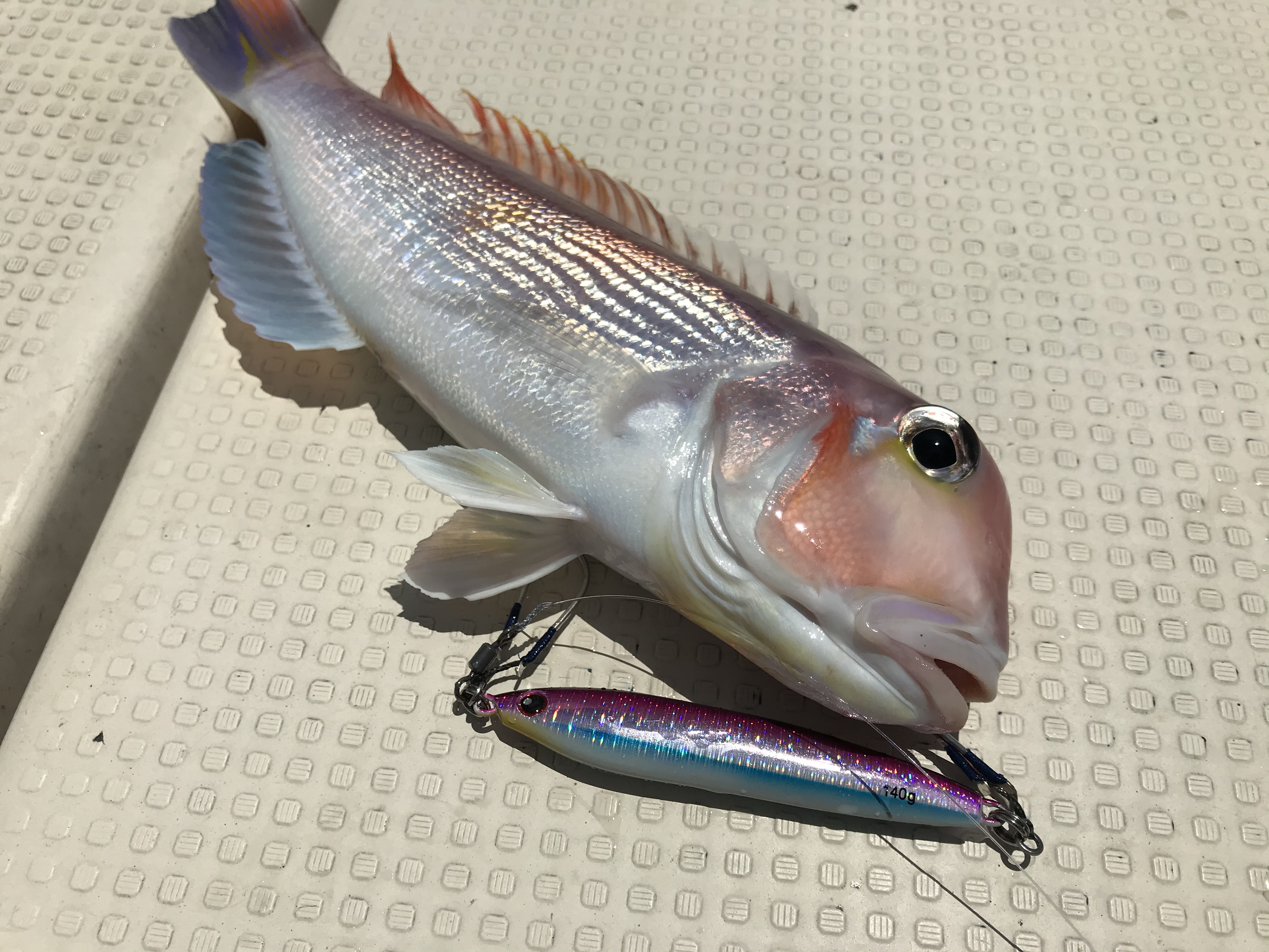 あまりにもサバが釣れるので場所移動。水深100m!ジグは100g!そしてまた大サバ。。。と思いきや、めっちゃ引く!青物ではない引き!上がってきたのは3Kg程のカツオ!!!ルアーフィリアジグミノー100g!