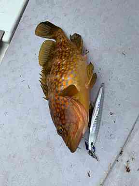 タックルはNEWのクレイジーオーシャン、オーシャンセンサーLJプラスのMLにセルテート4000C、PE0.8号のSLJタックル。早速同船者にヒット!ジグはフラッシュメタボTGの60gに海毛虫を1本セットしたもので他の同船者にも青物連発!ドラグを鳴らしてヒラマサ、ハマチが上がりました。私にはボトムでキジハタがヒット!やはり色々な魚種が狙えます。中には大型ヒラマサと思われるラインブレイクもありましたが何本もヒラマサと闘って無事ランディング!最近のSLJタックルは強いと実感。