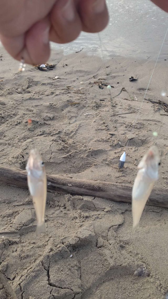 今日は早起きして近所の砂浜に様子を見がてら行ってきました。週末のせいか多くの人が並んでおり早朝にも関わらず盛況で入れそうな所を見つけ取り敢えずサンドポールを刺し準備し第一投!あまり遠くへ飛ばさなくても釣れているのは知っているが何となく投げたかったので100m程投げてみると即アタリ!!暫く巻いてくると更にアタリ!!「どうなっとんの?活性良すぎ~!!」と一人でテンションが上がり回収してくるといきなりのWヒット型はそれほど大きくはありませんが取り敢えずキープ。続いて二投目50m程の手前を探ってみるとこれまた即アタリ!!30号の天秤が付いていてもお構いなしの良いアタリが連発!結局11投して20匹と爆釣でしたが本日は出勤の為後ろ髪を惹かれる思いで納竿としてきました。行くなら今ですよ~!!