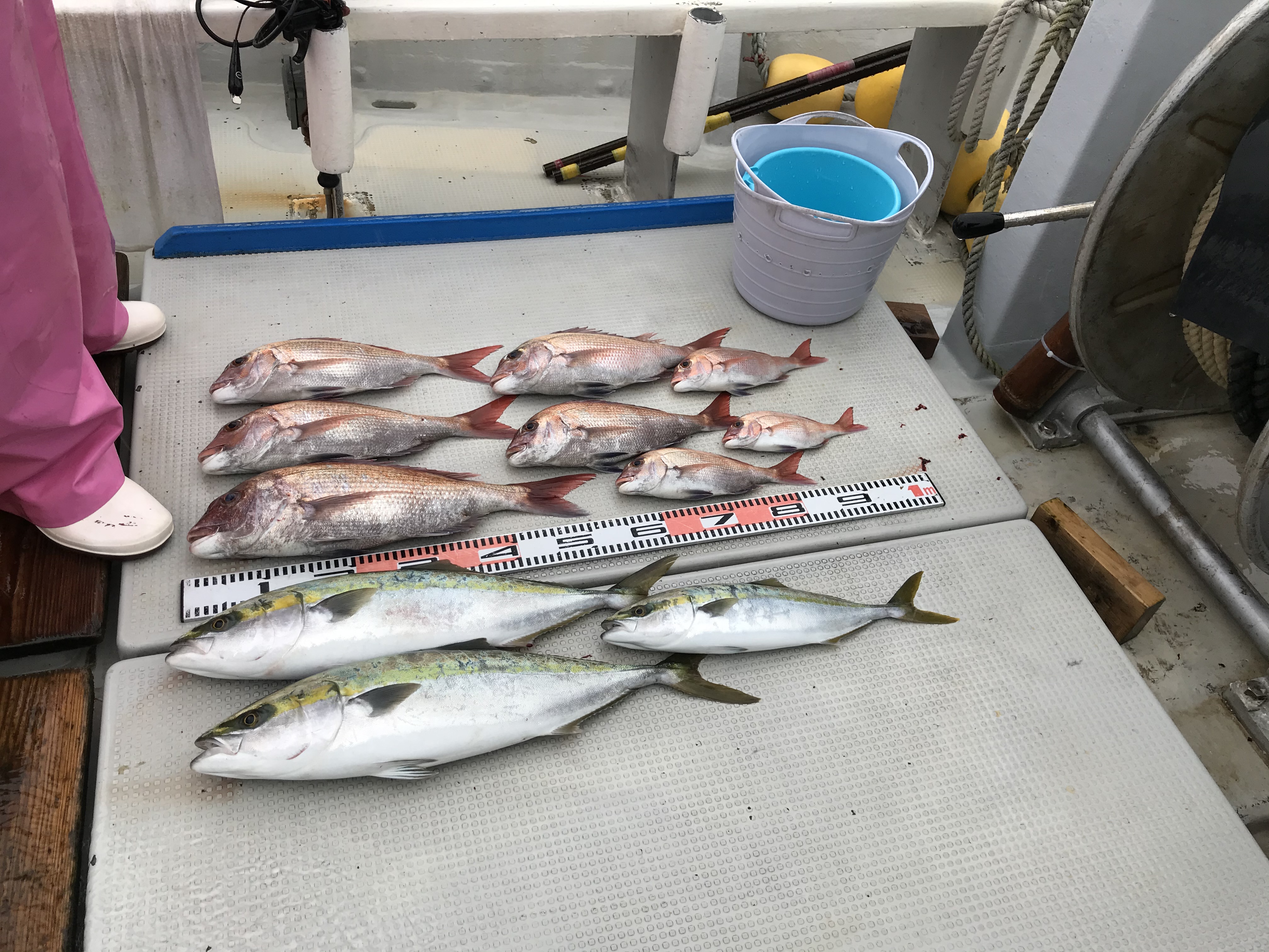 潮が動いたタイミングでワラサ、ハマチが釣れだし、餌が取られていたため捨て糸を伸ばすと真鯛も50cmと良型が釣れました。