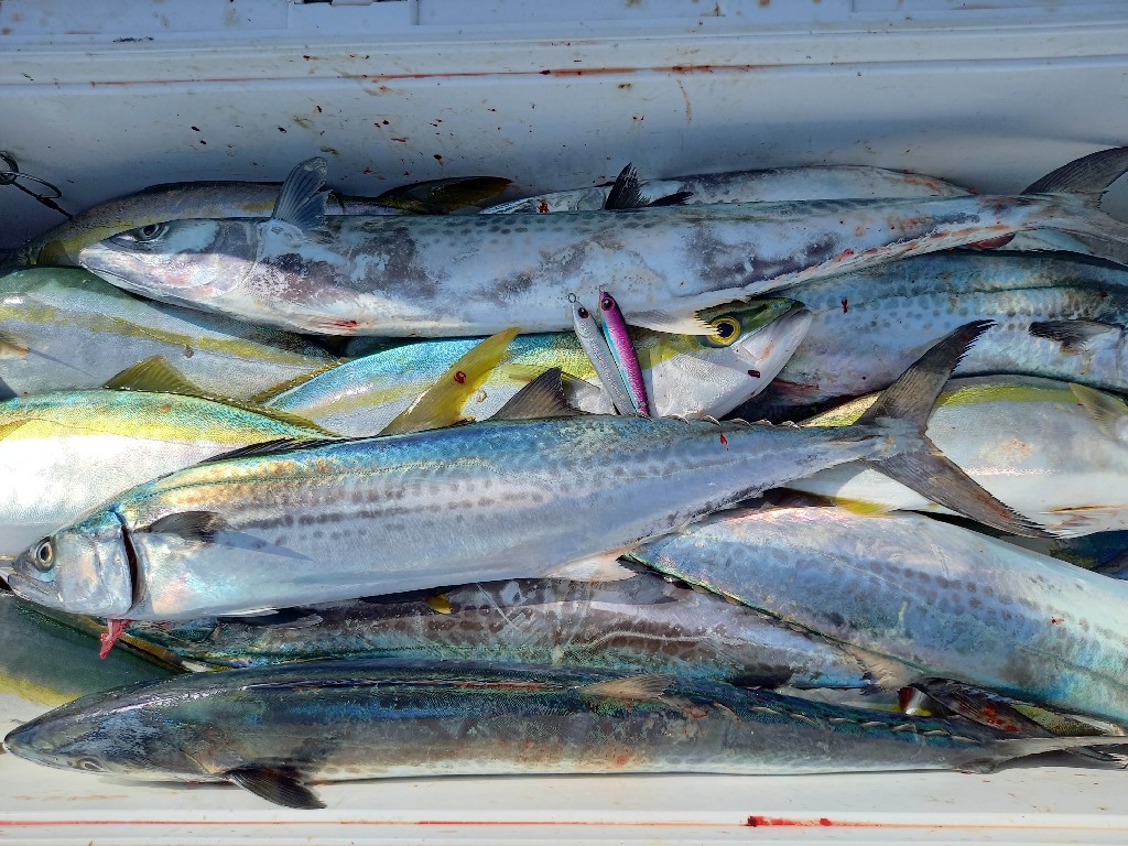 ゆっくり目の午前7時出船。出てすぐのところでツバスのナブラ。まずはルアーフィリアのジグミノー40gシルバー。ゆっくり巻くも無反応。早巻きでヒット‼️30㌢弱のツバス。そこからは入れ食い‼️ジグもいろいろ使いましたが、ジグミノーへの反応が一番‼️釣りすぎると後の処理が大変になるのでトップウォーターに変更。するとツバス減サゴシ率アップ。