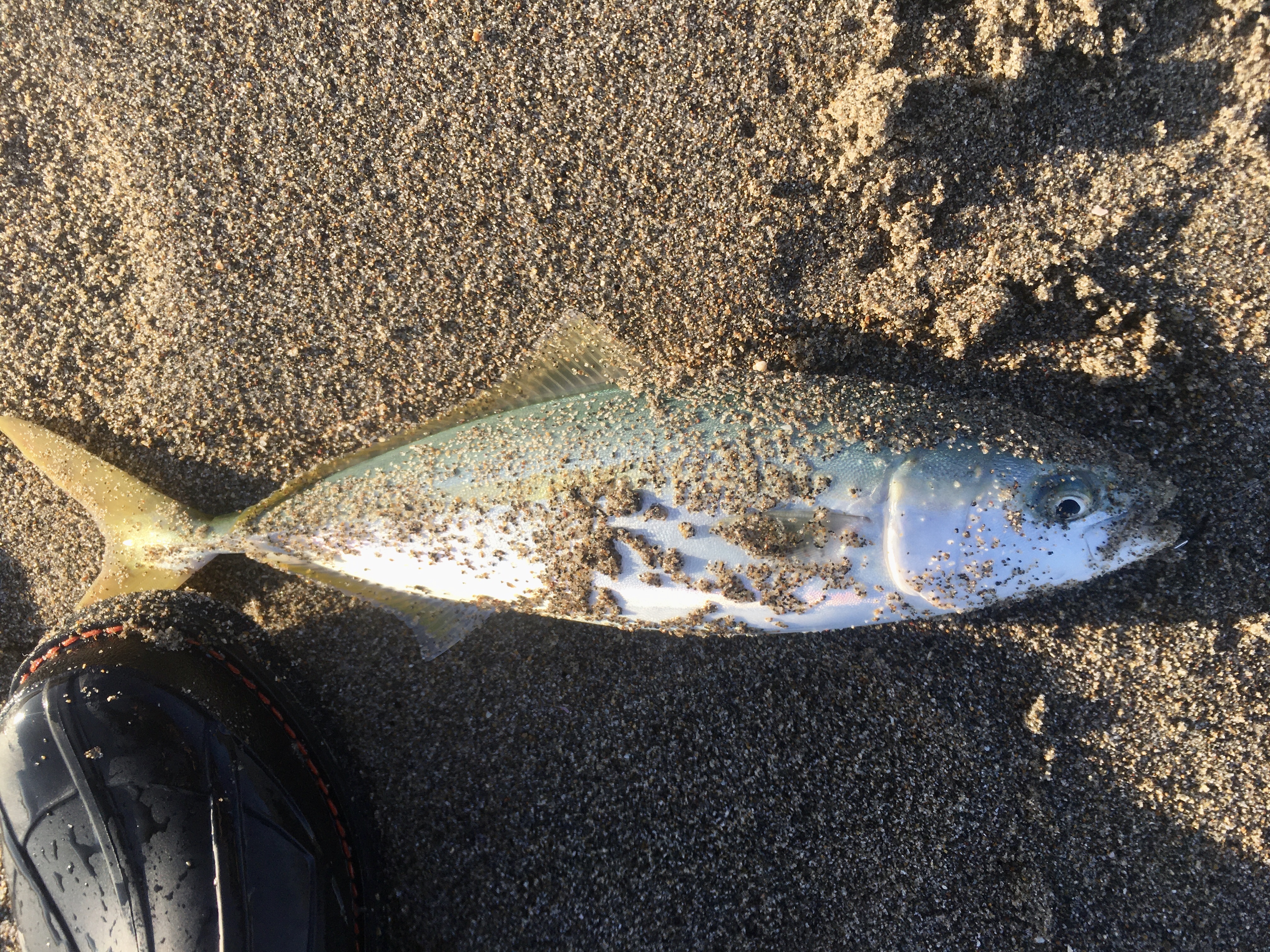 現地に到着した頃には、すでに沖の方でナブラが何箇所も発生中!ベイトの群れらしき黒い塊が見える場所で釣りを開始すると、予想通り目の前でナブラが!オーシャンフラッシュNAでレンジを時々変えながらアクションさせる事で、ハマチが連続ヒット!ストリンガーを忘れたので2匹だけ持ち帰り、元気そうなのは全て逃しましたが、結果的に7匹ハマチがヒットしました!