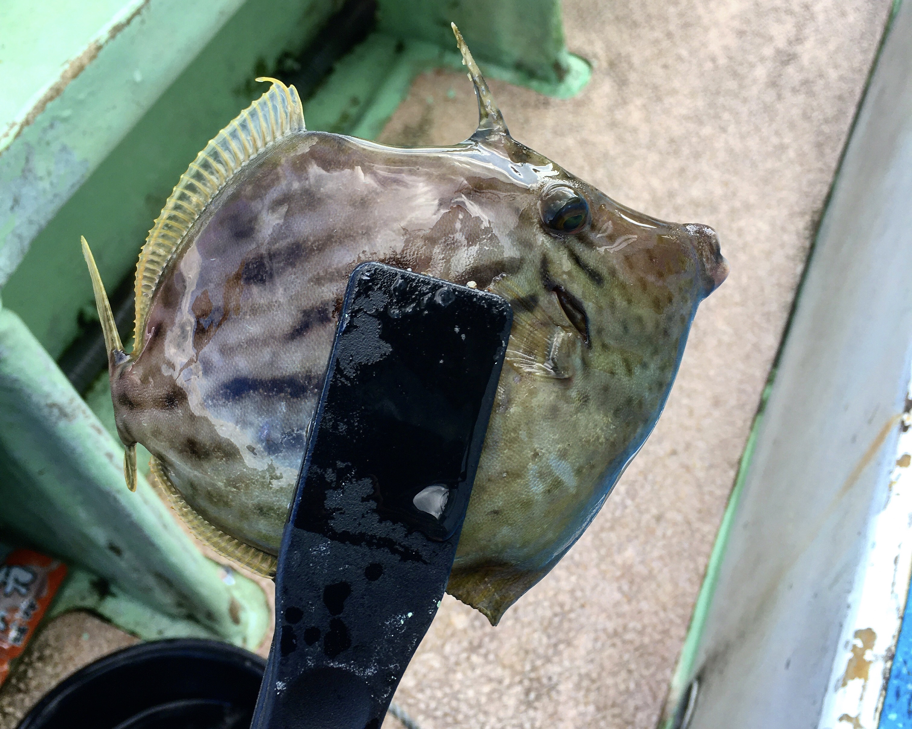 竿貸すよ?と言われて竿を使わせていただいてら、ものの数投でカワハギが釣れました。