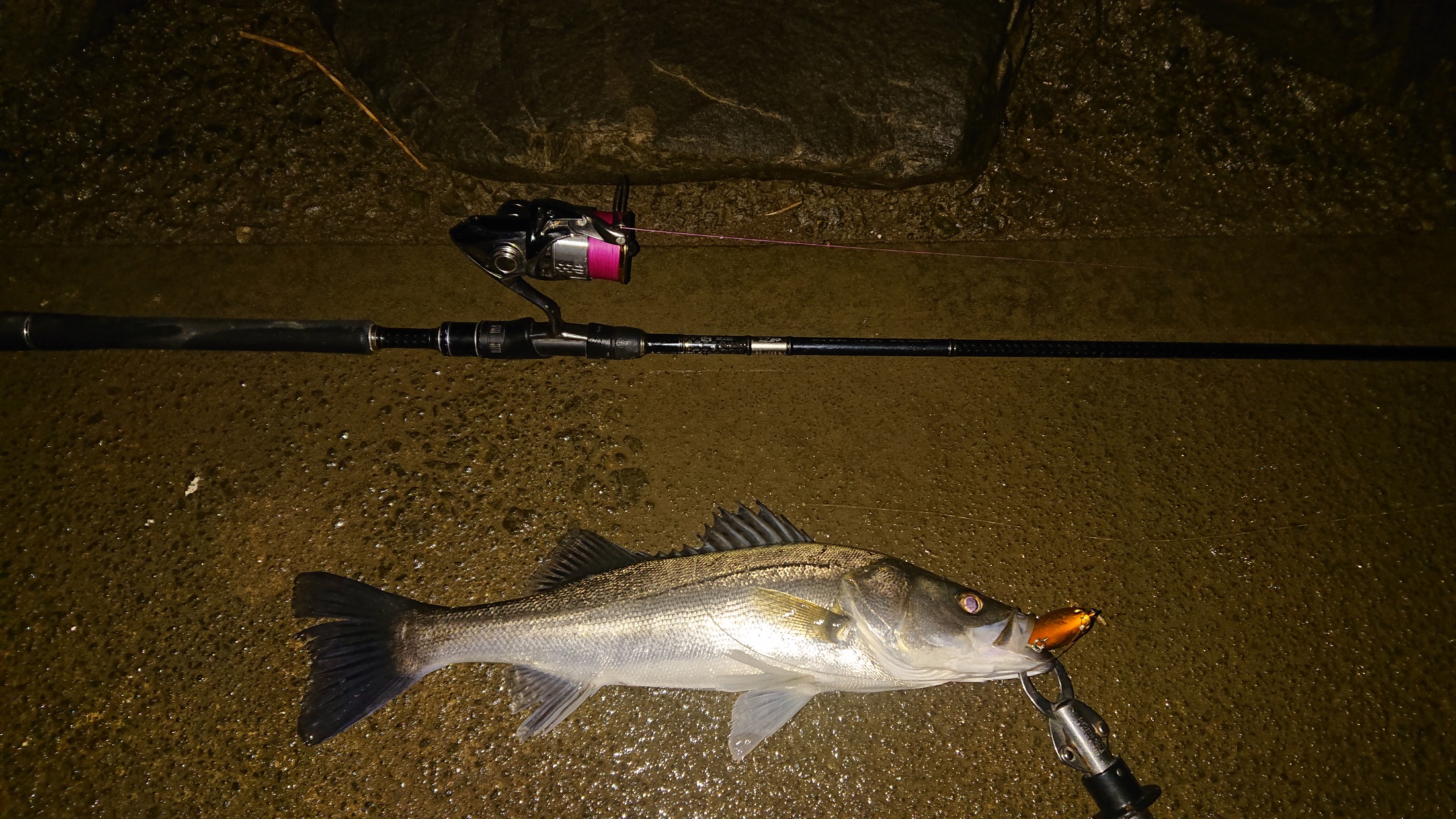本日は木曽三川方面に知人とシーバスを狙いに行ってきました、1カ所目のポイントは不発で2カ所目は人が入っており河川を変更して釣り開始して、エアオグル85SLMで沖目にあるブレイクを上を通すとシーバスヒットしてキャッチ出来ました。その後は流れの変化している所を再びエアオグルで流して変化している所を抜けた瞬間にヒットしてもう一本追加して終了しました。