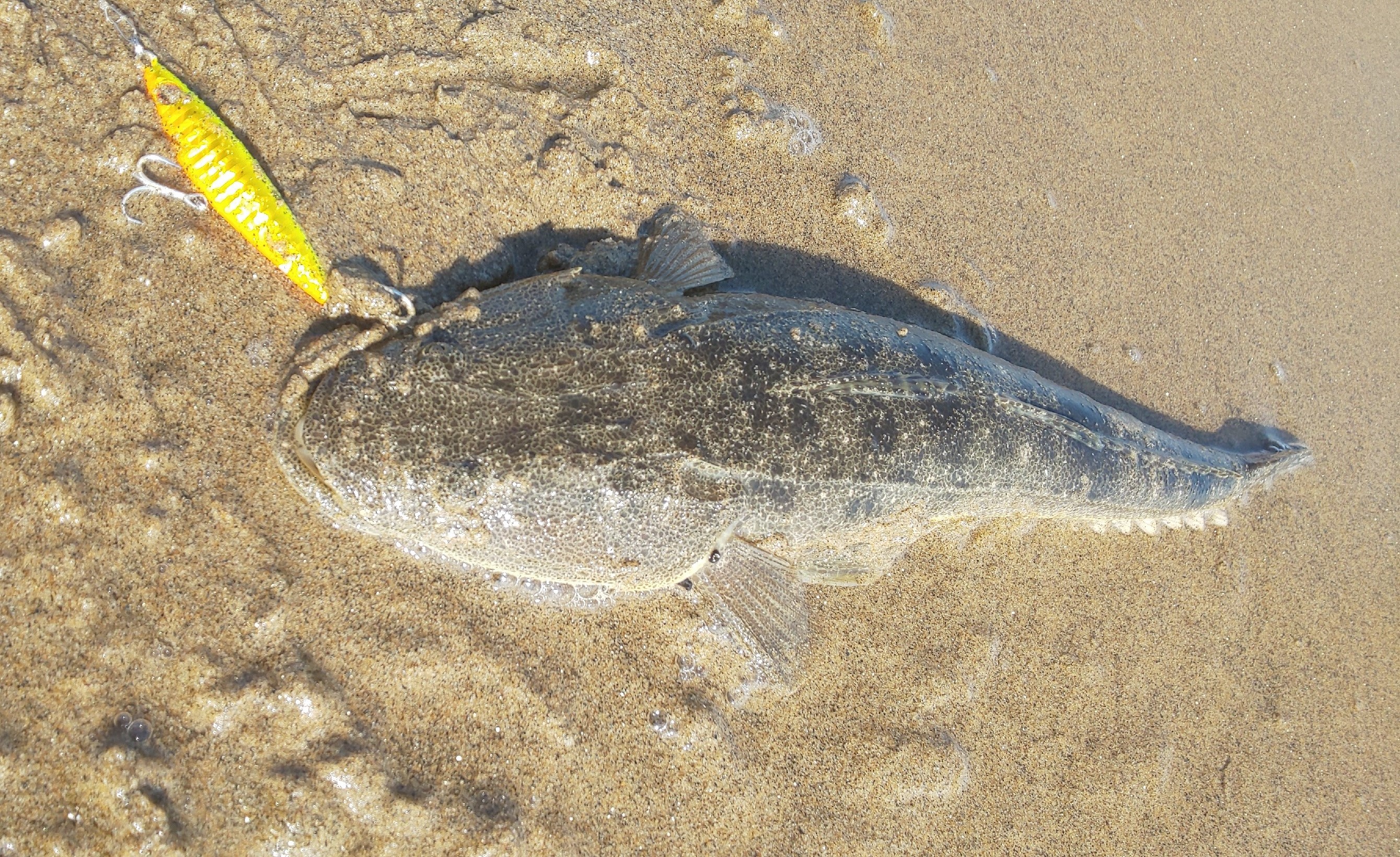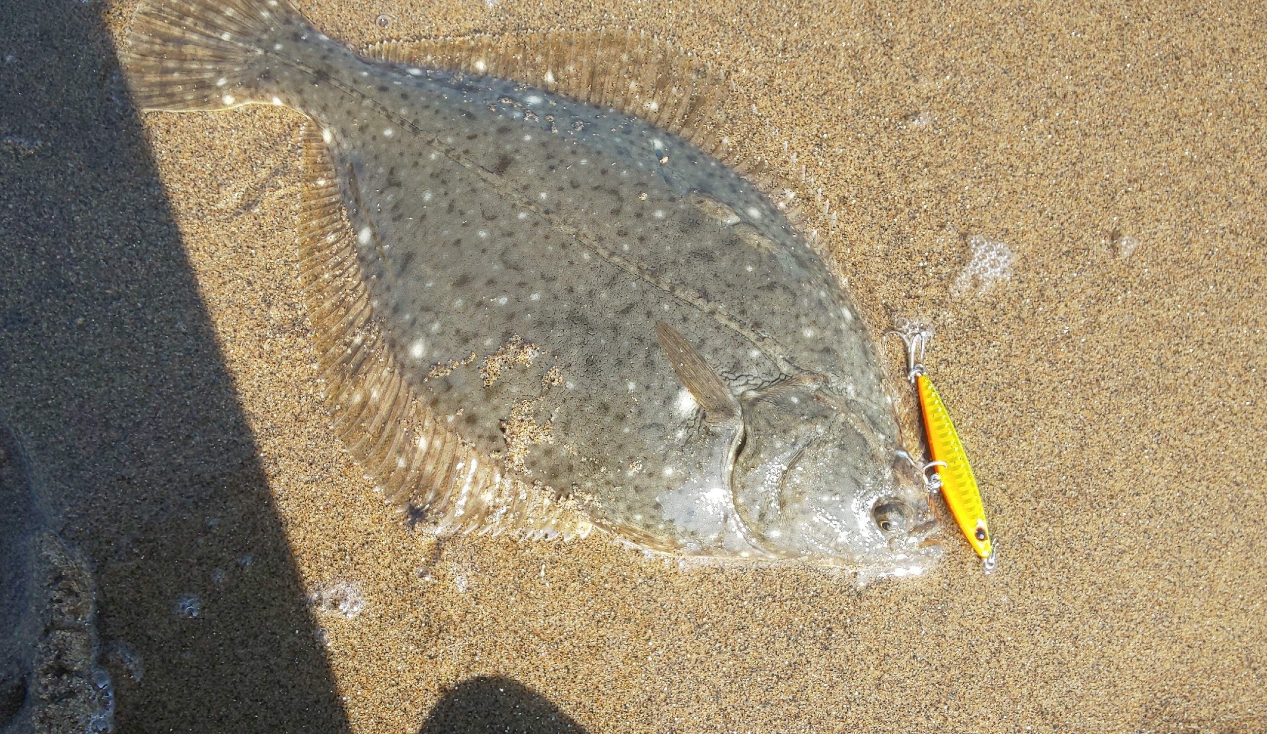 潮が上げ始めたタイミングでとなりのルアーマンがフラットフィッシュらしき魚を釣り上げていたので、ルアーをオフベイトに変えて探っていくとガツンとヒット!