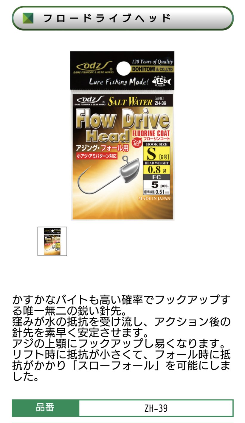 風もなくアジングに最高の日和なので、南鳥羽方面へ釣行しました。潮のタイミングは最悪で干潮潮止まりに釣りをしなくてはならない時間に現場到着です(汗) とりあえずライトの効いている場所でキャスト!いきなり『カツンッ!』という良い反応で18cmがロッドを曲げてくれました。これは幸先が良い♪とスグにキャスト!またまた同じ反応で10分の間に連発で10匹獲れたので他のポイントで試しましたが…、無反応でした。この日は、18〜20cmを20匹程釣り終了しました。反応が弱く出てもお気に入りの『オッズ フロードライブジグヘッド』は確実にアジの口を捕らえ釣果アップにつながるアイテムです。ヘッド形状も水の抵抗を上手く捉えてくれるのでアタリも大きく出る感じです。