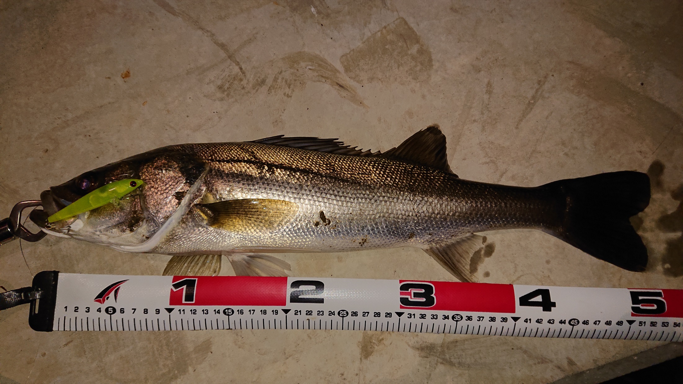 仕事帰りにシーバス釣行して来ました。今回は色々なポイントをラン&ガンしました。干潮に向かう潮周りで、風は少し強めでした。こういうときはエリア10だと飛び難いのでローリングベイト77が有利です。飛距離良し、釣果良しの最高のルアーです。最初のポイントですぐに反応がありヒット!しかしエラ洗いでバレてしまいました。最近思うことはローリングベイトは食わせ能力が高いが欠点を一つあげるとしたらバレが多いということ。私の経験値不足のせいですが、次にヒットした魚もことごとくバレてしまいました。ん~難しい・・・。魚がスレてしまったのか反応が無くなったので移動しました。次のポイントでもすぐにヒット!!しかし、この魚ヤバイ・・・デカイ・・・ガッツリ掛かっているのかバレることは無さそうですがドラグが作動、ロッドを立てて耐えていると障害物にスレている感覚が!!そしてフッ・・・ブレイク。やってしまった。見るとPE側では無くリーダーが切れてました。名港シーバスをやり込んでいる方に聞くとラインは太くても食わせには影響しないそうです。その方はPE1.2号にリーダー8号のセッティングで通年やられるそうです。まるでサーフで使うようなセッティングです。PEは細くてもリーダーは太い方が良いようです。今回身をもって体験し、反省致しました。気を取り直してやっているとすぐに次の魚がヒット!今回は慎重に迅速にやり取りしキャッチ!57cmでした。写真を撮ってリリース。綺麗な魚体でした。その後もヒットはするもののエラ洗いでバレ、獲れたのは1匹だけでした。活性が高くヒットするものの獲れないのが悔しく考えさせられる釣行でした。
