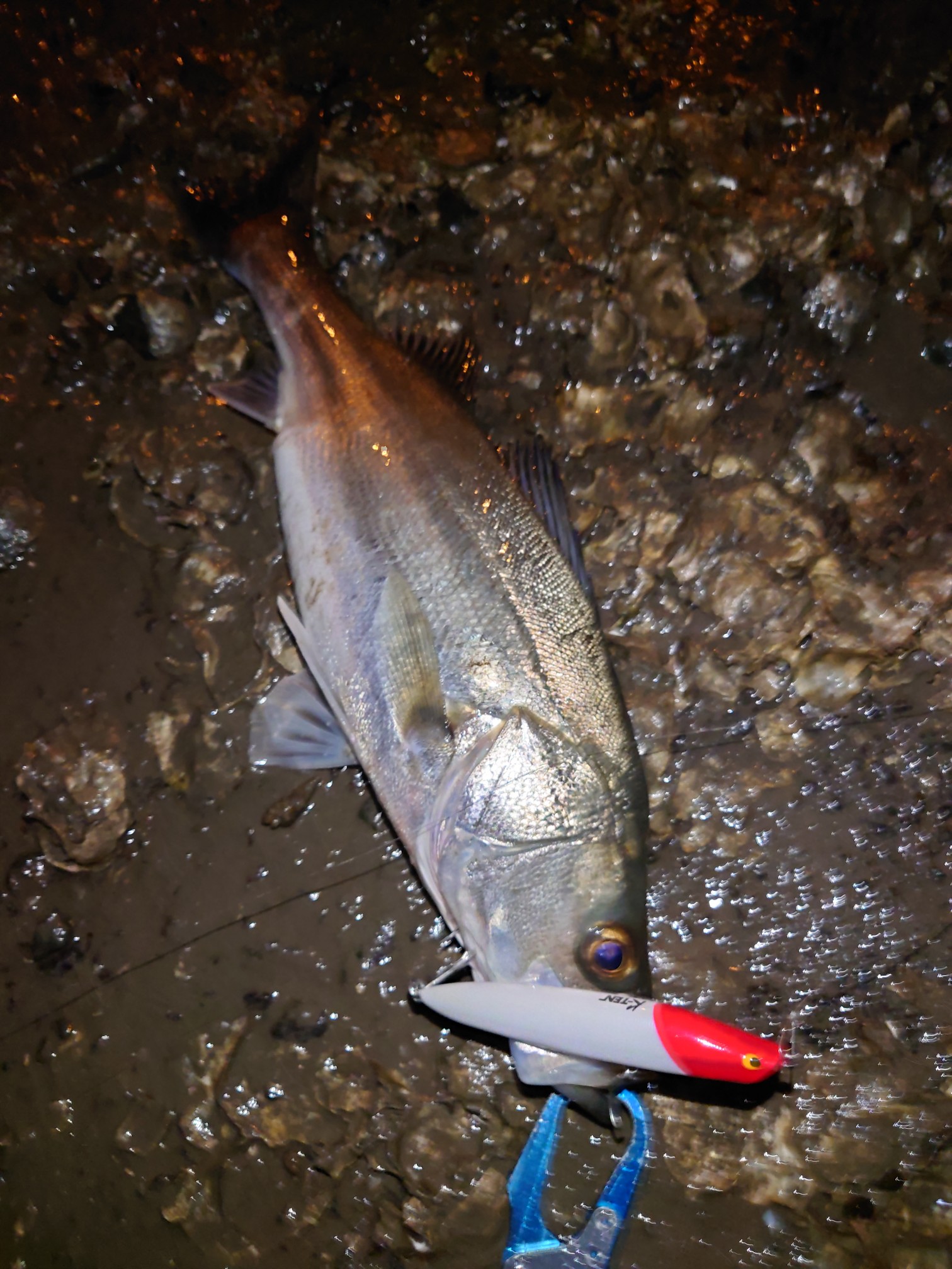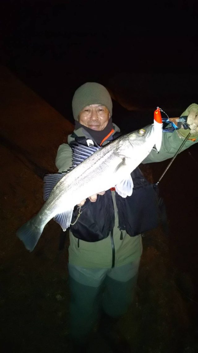 三重県の伊勢方面もシーバス好調!と情報をいただきS師範にガイドをしてもらい接待釣行をさせていただきました。『もう、釣れて!釣れて!』という嘘くさい言い方に、乗っかって22:00にポイント到着。エントリーポイントを教えてもらいリトリーブコースまで丁寧にガイドしてくれる彼は…、やはりジャンキー?! とりあえず教えてもらった通りキャストしていると底の形状やエグレが何となく判り楽しくなってきました。引き潮ど干潮のタイミングでポイントに入ったのでかなり流れが有り早く引くと底に当たる感じなので水面下を引けるタイプのルアーで通していくと…、「コッ…!ゴゴン!」と反応が有りロッドが絞り込まれました。流れが強いので静かにやり取りしてキャッチしました。幅広のグッドコンディションのシーバスを釣らせていただきました。その後、S師範もシーバスをゲットして仲良く家路につきました。