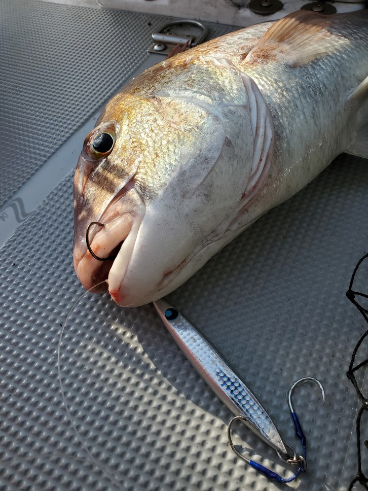MSマリンさんにお邪魔してジギングへ行ってきました。一日、渋い中、サワラ、ワラサからの反応あるもバラシ、最後に真鯛を仕留めて終了となりました。すべてウロコジグショートでのヒットでした。