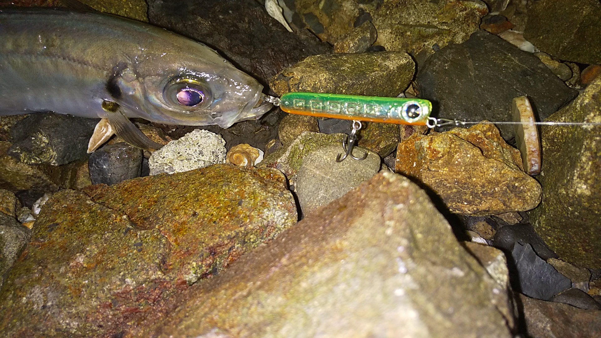 ポイントに着くとライズがポツポツ出ていたのでアムズデザインのコレットで表層チェック…するといきなりのまあまあメバルをゲット。その後はライズの多さにもかかわらず反応ないため、ワームに変えると…正体はアジ。投げるたびに反応があり、次々アジを追加できました。