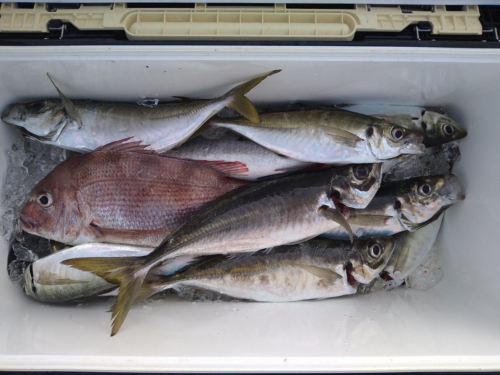 こんにちは~焼津街道店の三浦です。3月30日の朝2時出船の大友丸さんのアジ釣りに行ってきました。今回は釣りが大好きなしゅんすけ君も参戦!副店長と私でしゅんすけ君親子をサポートする予定でしたが、予想以上にウネリが残っており、お母さんは船酔いでダウン・・・ということで副店長がしゅんすけ君のサポートで私は釣り開始。しゅんすけ君は開始早々大きなアジが釣れて大喜び。その後もポツポツ釣れています。しばらくするとまさかの副店長も船酔いで私がサポート交代。3時過ぎから入れ食い状態になり、真鯛と大アジのダブルヒットなどもあり、船上で大はしゃぎ!その後も釣れ続け3時間の短時間釣行でしたが、しっかりと楽しんでもらえました。大友丸の船長はとても優しくて釣り初心者の方も安心して乗船して頂けます。なにより釣らせてくれるので、また行きたくなること間違いなしです。船長~今回も楽しませて頂きありがとうございました。