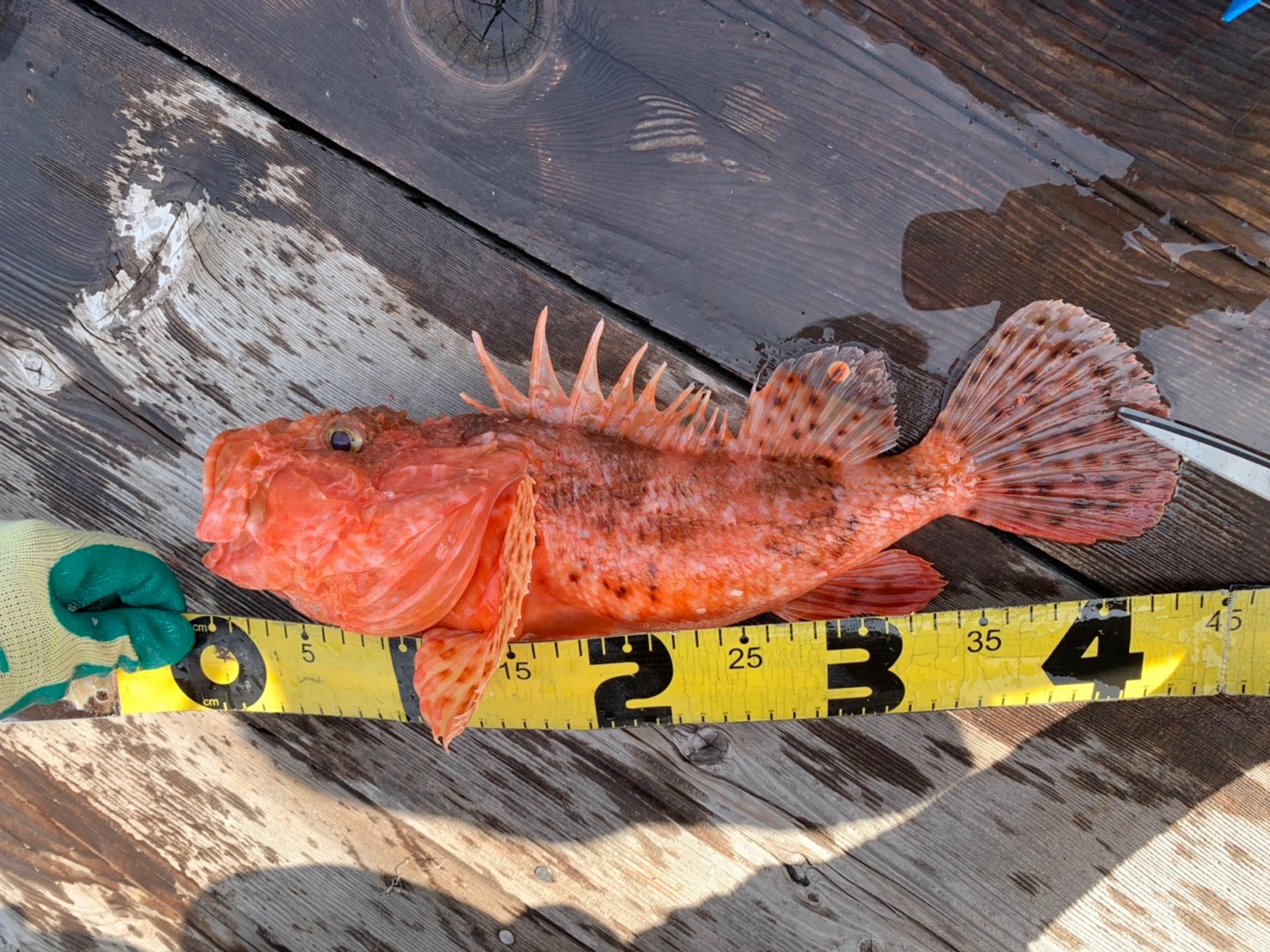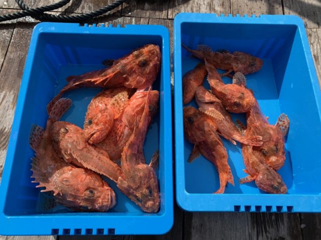 三重県南伊勢町の海晴丸さんにお世話になり、鬼カサゴを狙ってきました。午前7時出船で、ポイントまで約1時間程で到着し、沖に出るとやや風が気になりましたが徐々に無くなる予報で一安心。水深は180m前後からスタート!開始1投目からアタリが続き、魚の活性は高め!小さいアタリでしたが、巻上げ途中でも叩く感じがあり本命ゲット!釣り上げた鬼カサゴがエビを吐き出し、食性の勉強が少しできました。この後も飽きないぐらいに釣れ続け、3人で25匹の釣果。外道も混じらず、鬼尽くしの楽しい釣行となりました。