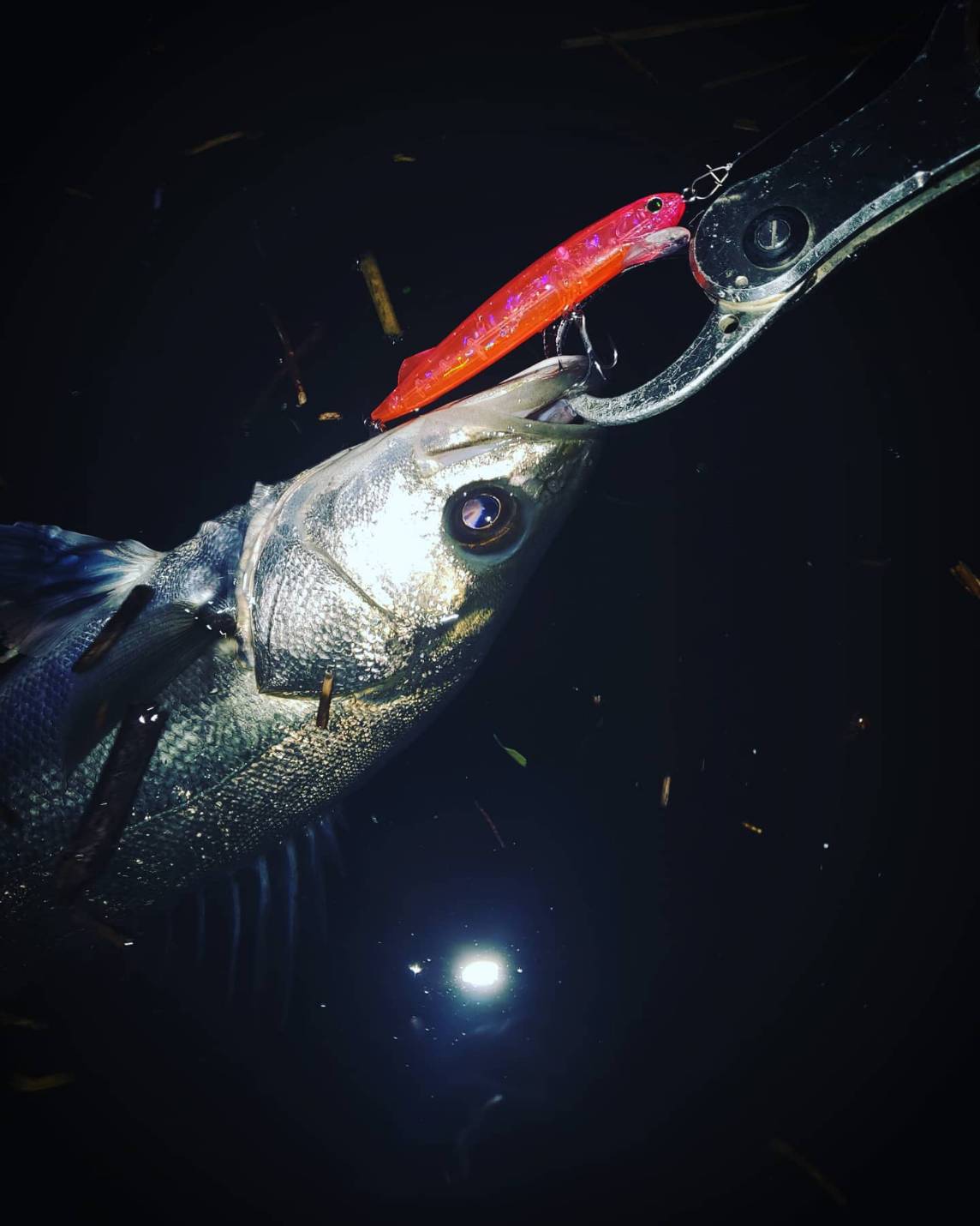 友人と衣浦方面にシーバス釣りへ行ってきました。まずは友人にヒット!マニックのスロー巻きで中層を攻めるとヒットしたとのことでした。バチも中層をふわふわと漂っている感じでしたのでレンジが肝だったかもしれません。その後、潮が緩くなり渋い状況。そんな時はIGK96!月夜という事もあり、クリア系を選択。何とか反応してくれました。