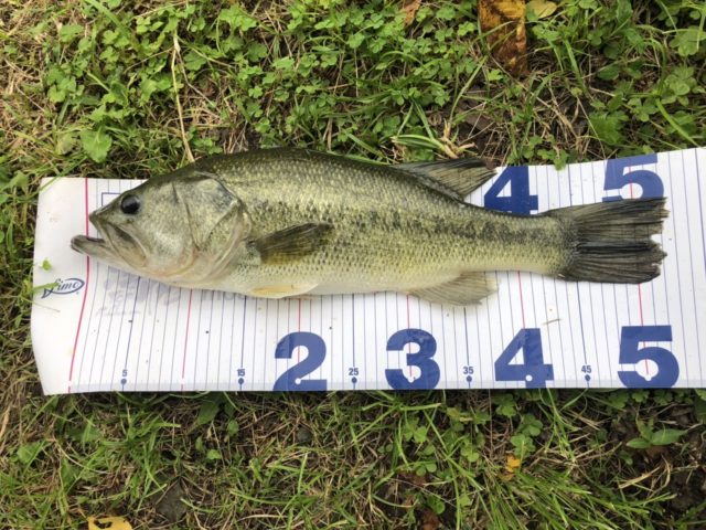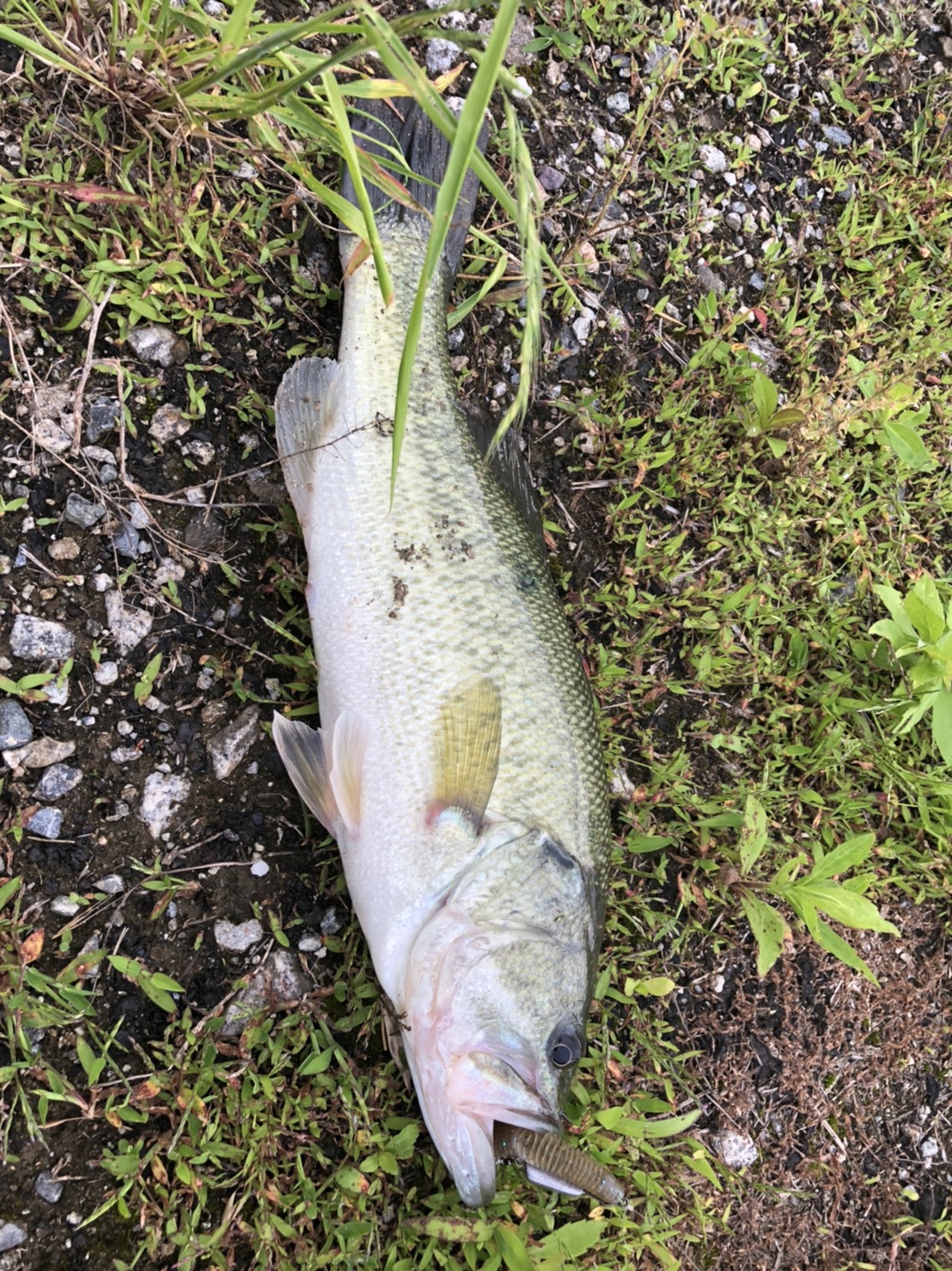 近くでバスの釣れる場所ないかなと、探してみることに。野池に行ってみると先行者2名。聞いてみると釣れないとのこと。とりあえずやってみるかと久しぶりのベイトリールで投げ始めると二投目で大バックラッシュ、、、10分程かけて直しているとバス?コイ?魚が浮き上がってきたので浮いた魚の向こうにベロディを投げて細かくシェイクしながら頭の前を通していくとズシン!と後ろから別の魚が食ってきました。その後先行者が帰られたので空いた場所を見てみるとデカイコイとバスが2匹で泳いでいます笑一応投げてみるも無視。もう一度通すと木が沈んでいた場所で巻けなくなった。根掛かりかと思ったが泳いでいる!フッキング!上がってきたのがなんと52cmのビッグバス!ベローズスティック&ベロディこれ釣れすぎるなあ