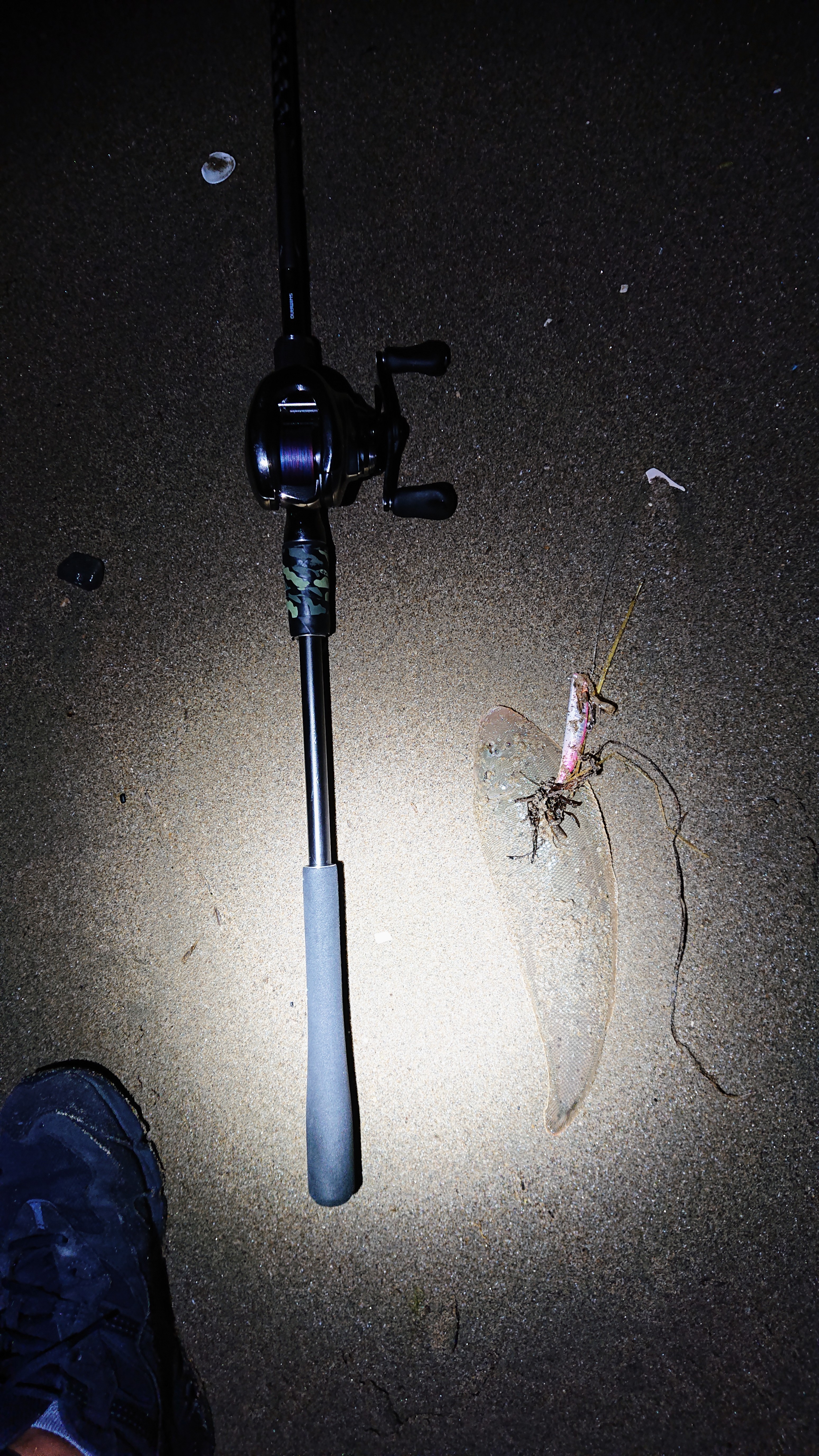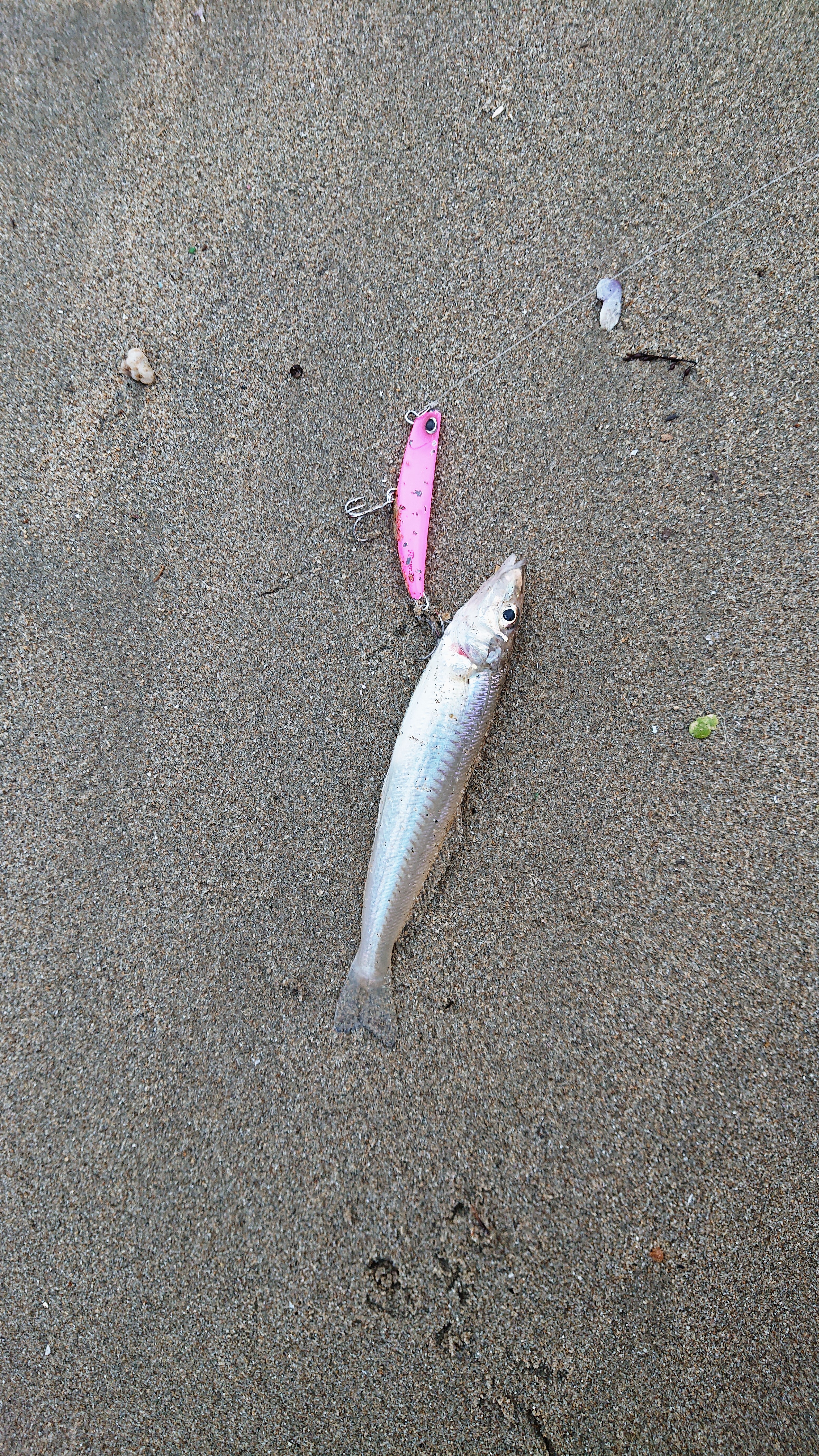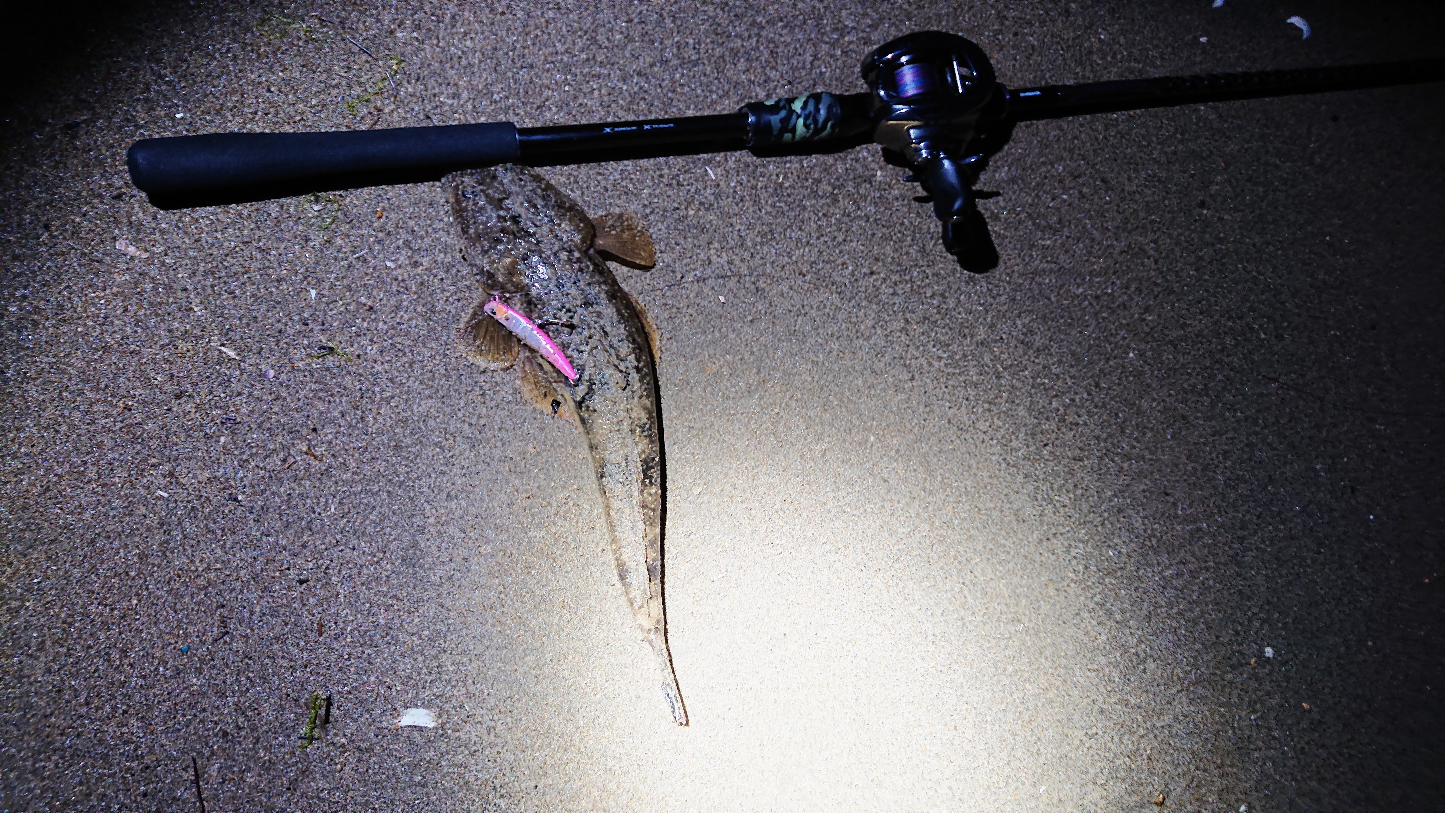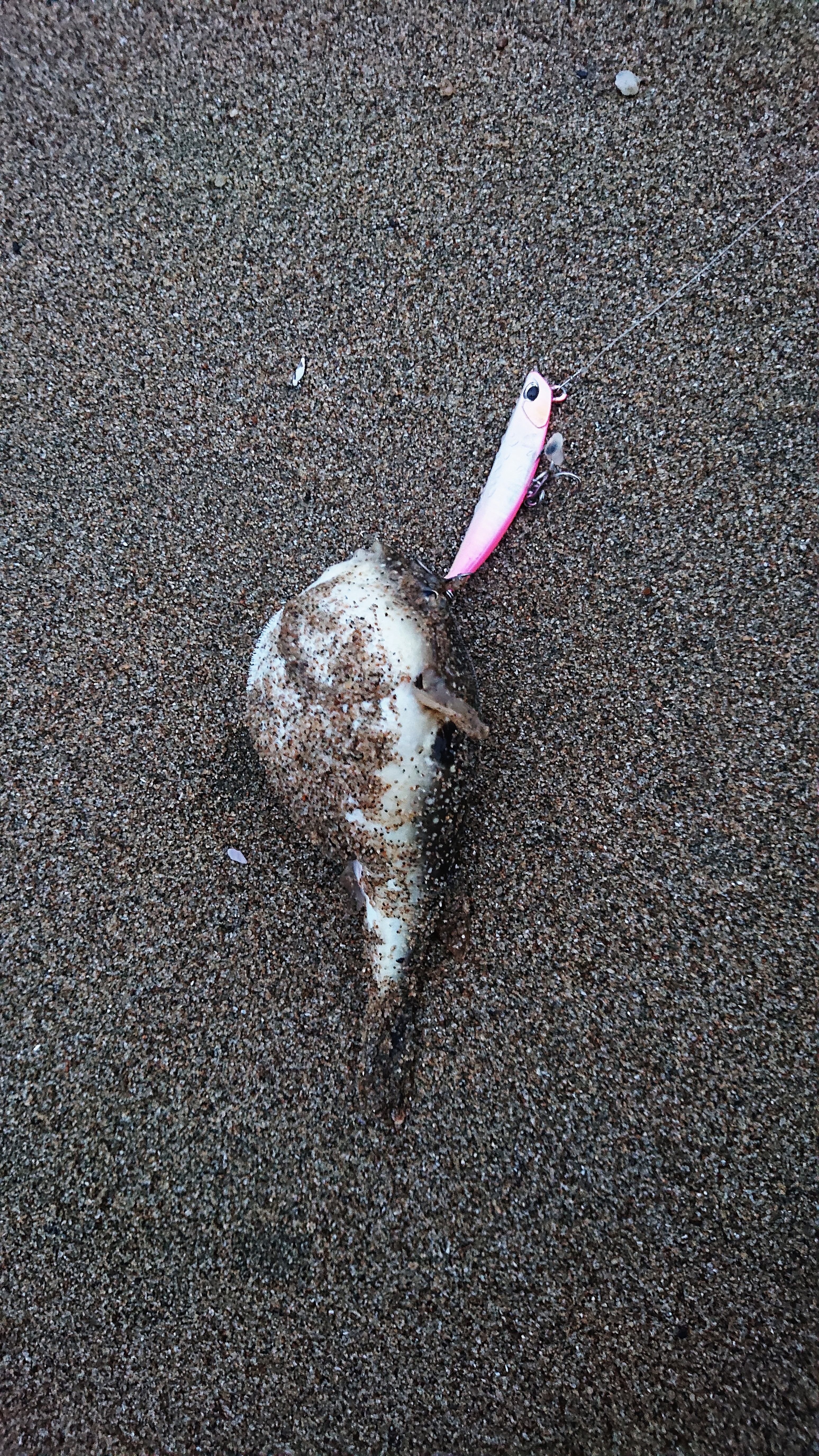 雨上がりにベイトタックルでマゴチ釣りに行きました。フリッパー32gで80m~90mくらいの飛距離が飛んでいきます。津方面サーフから開始。どこもみている限り、少し濁り気味でリフト&フォールしていてもアタリらしきものがありません。トゥイッチ気味で小さくフリッパーを動かしていると何故かキス。そして、次はフグ。そこから少し移動します。最初は、手前側をワームで誘いますが変化なく、沖をスピンビームで探っているとゴンッとアタリ、あがってきたのはマゴチ!(ここで携帯の電源が切れてしまいます。)次にフォローでフリッパーを入れてルアーの移動を細かく動かすとまたマゴチが釣れました。移動しながらもう一匹追加し、充電しなおして再度釣行開始。日もくれ始めて、ゆっくり目に巻いていると思いアタリが!大きめのマゴチと小さいマゴチを追加して、この日は納竿しました。ベイトタックルですと、スピニングタックルに比べて飛距離が少し落ちる反面、ボトムの釣りになりやすいフラットフィッシュゲームでは、感度が高くなる分アタリの判別がつきやすく感じます。また、ショートバイトが今回多かった為、試験的ですが、ピアーズトレブルフックをリアだけ交換(ベリーを交換すると背中に針がのっかってしまう為)しました。今回もリア一本だけ口にかかった状態の個体もいましたので、オススメかもです。