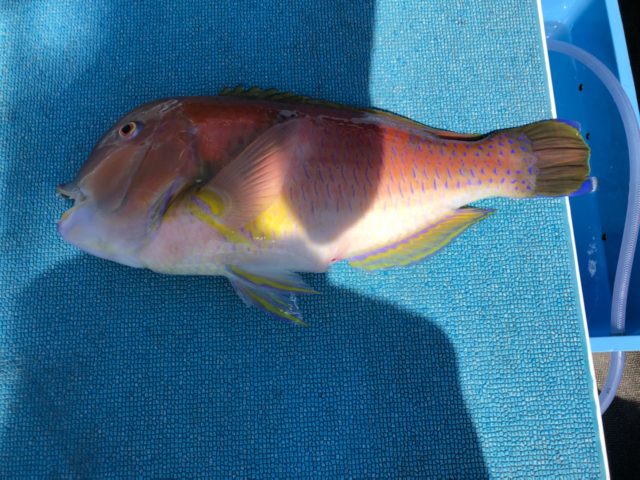 石鏡の幸徳丸様にお世話になり、船から石鯛を狙ってきました。港から約20分走り、こんな所に石鯛居るの?と思う水深40mのポイントに到着。市販の泳がせ仕掛けハリス10号以上を使い、オモリは60号の指示がありました。恥ずかしながら、ヤドカリの付け方が分からず船長に教えてもらい釣りスタート。本命・石鯛は竿を叩くアタリが出るようですが、私には少し違ったアタリがあり上がってきたのはイラ。小さいアタリでもあるとドキドキしますが、この日は本命見れず…。同行の杉野さんは2枚の釣果!またチャレンジしたいと思います。